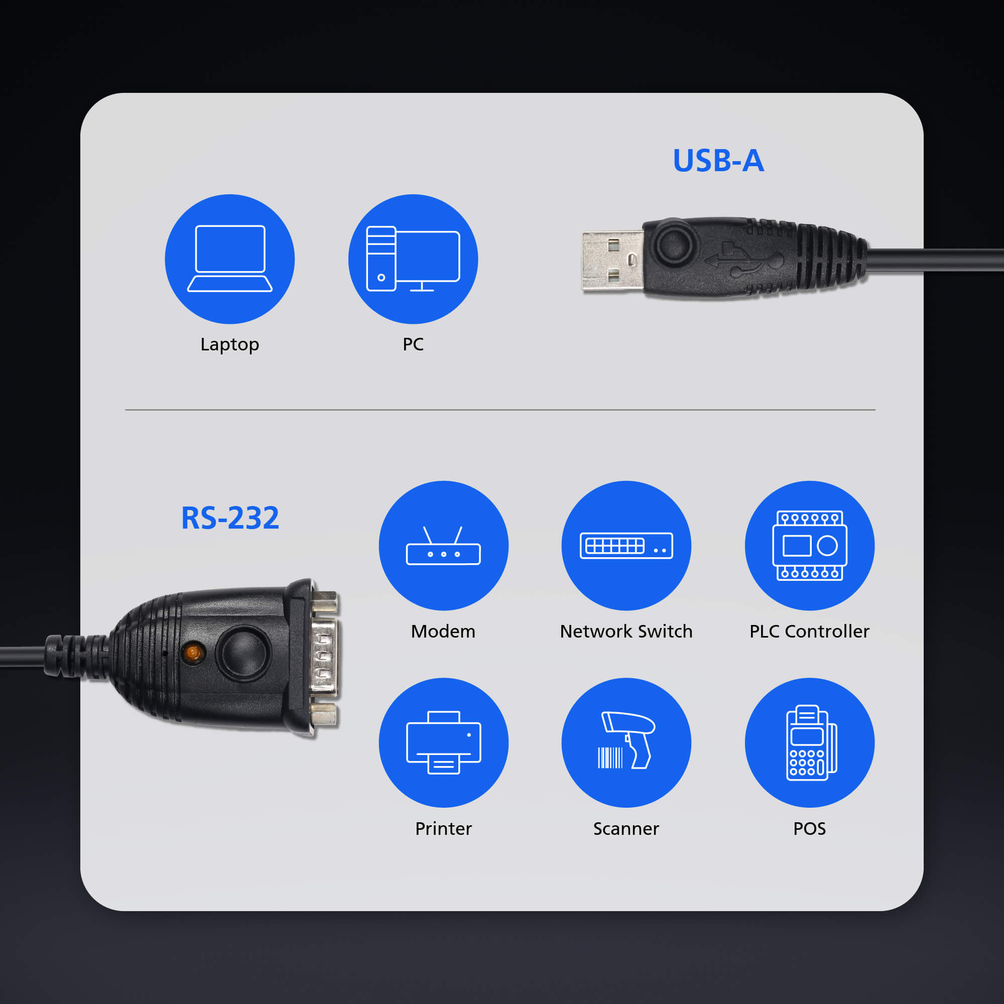 UC232AF allows your PC or laptop to control and communicate with various RS232 serial devices such as modem, network switch, PLC controller, printer, scanner, POS and so on.