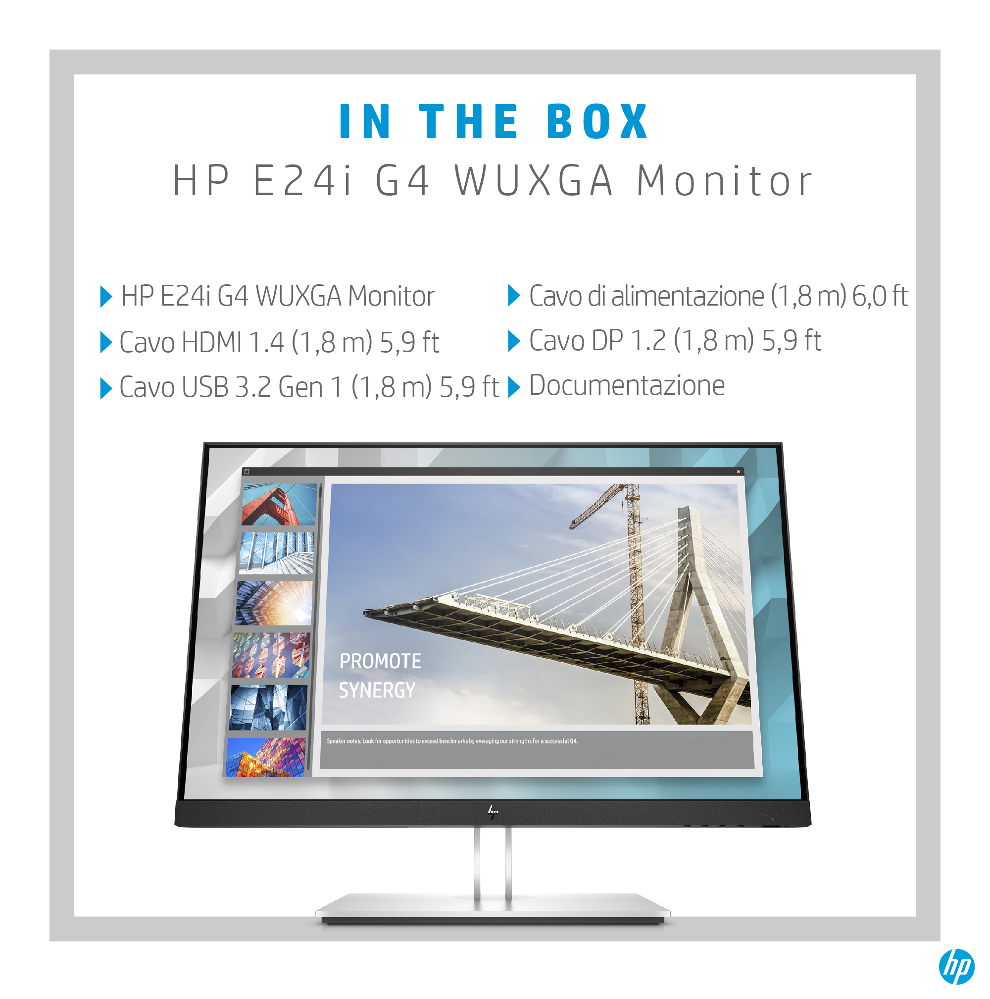 The HP E-Series E24i G4 WUXGA Monitor computer monitor features a sleek, modern design with narrow bezels that maximise screen real estate and minimise distractions. Its sturdy, adjustable stand offers flexibility to suit various desk setups, while the matte finish reduces glare in bright office environments. The overall build quality reflects HP’s commitment to durability and professional aesthetics, making it a valuable addition to any Australian business workspace.