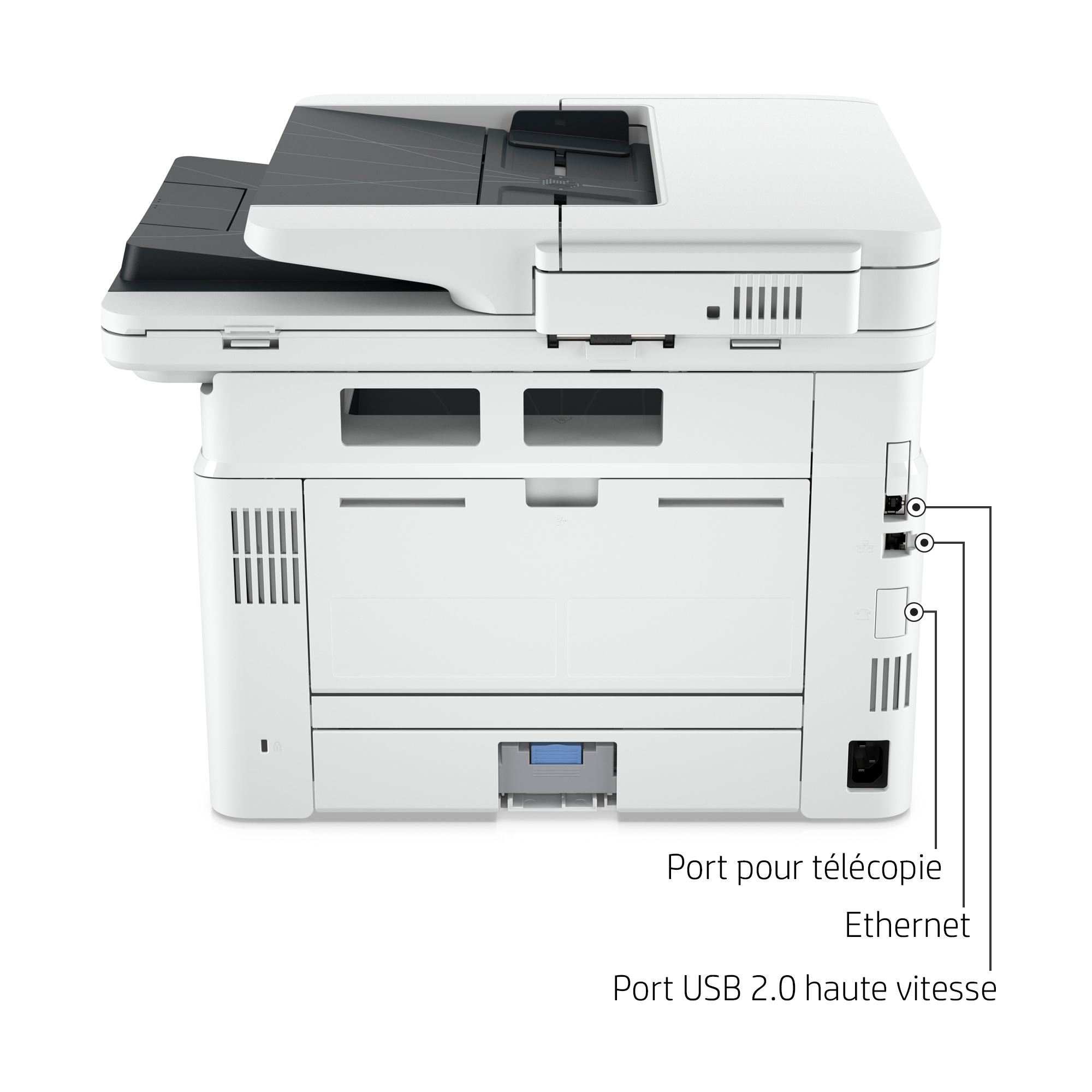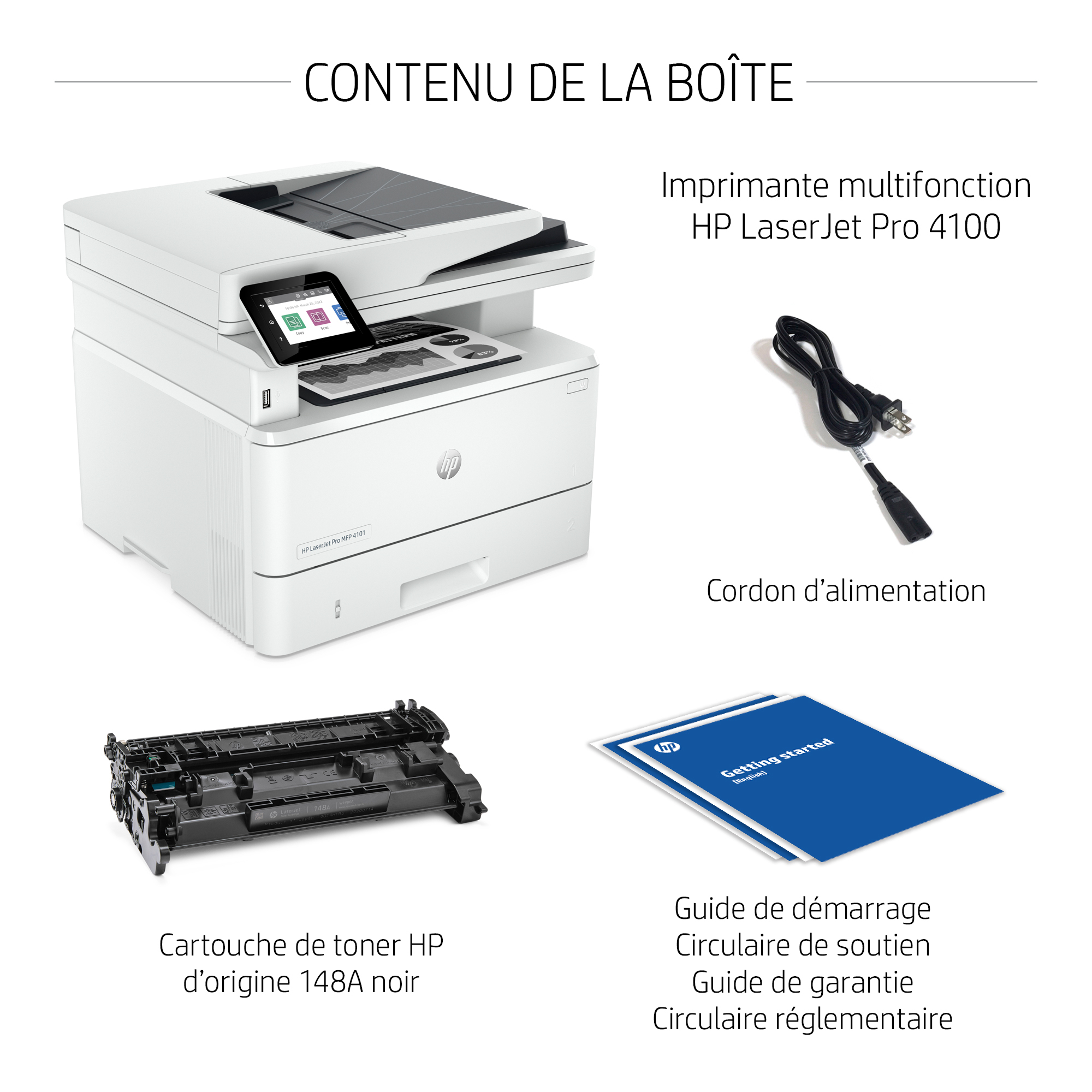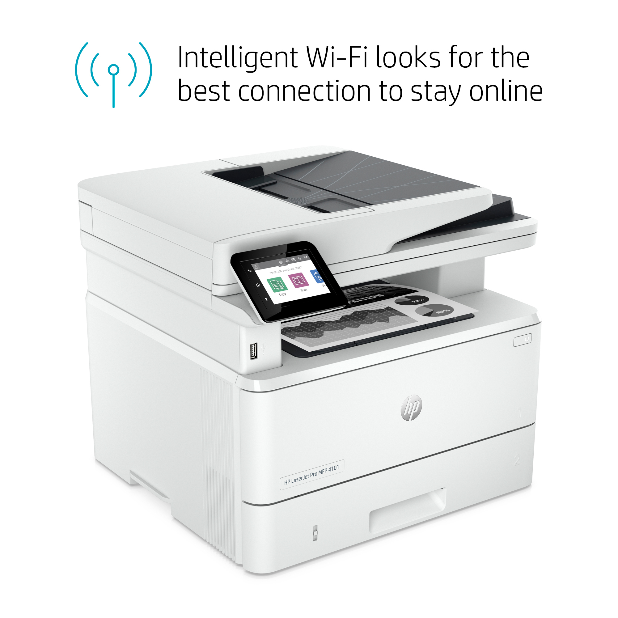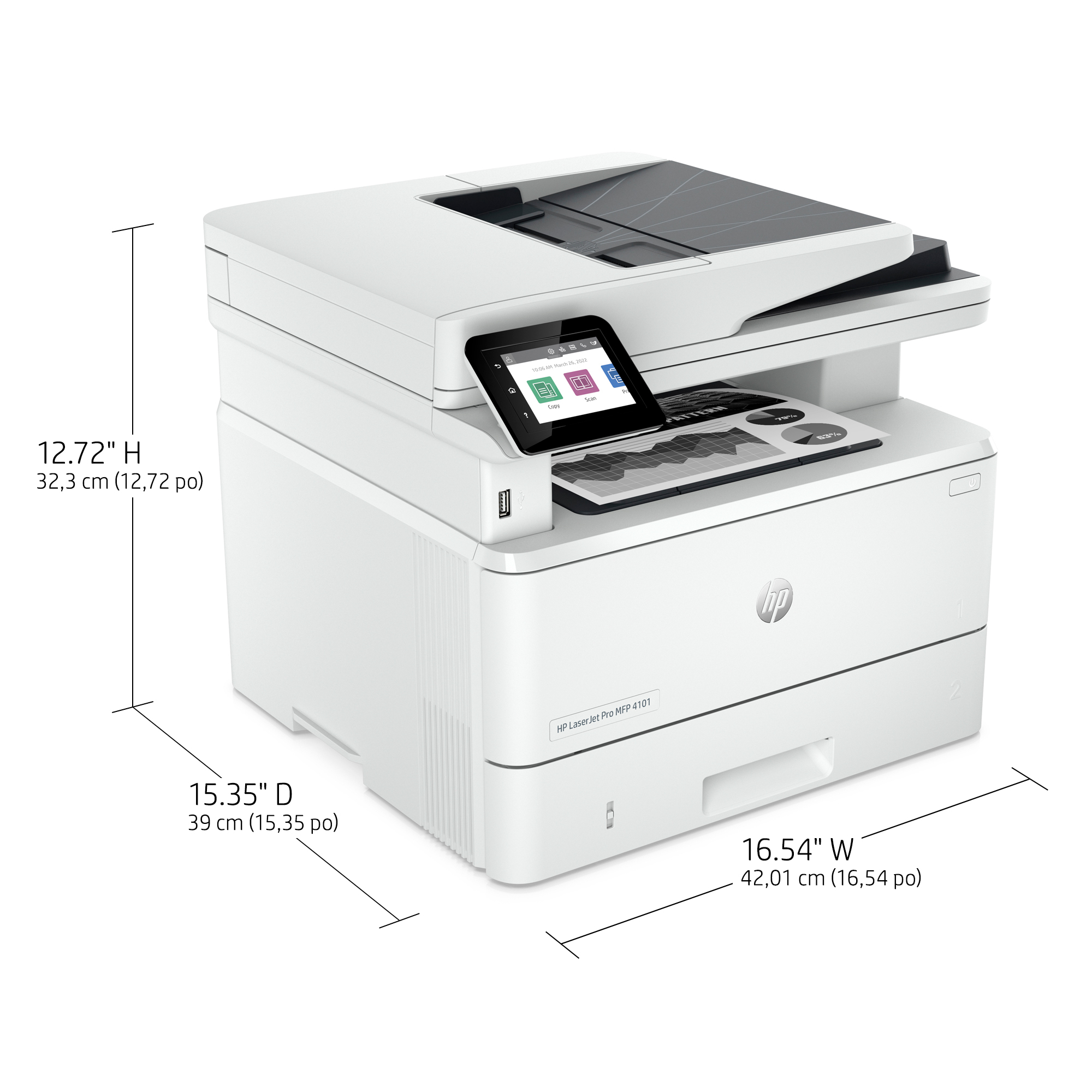The HP LaserJet Pro MFP 4101fdw Printer features a sleek, compact design that fits comfortably in modern office spaces without sacrificing functionality. Its matte black finish and clean lines convey professionalism and durability. The user-friendly touchscreen interface is ergonomically positioned for easy access, enhancing the overall user experience.