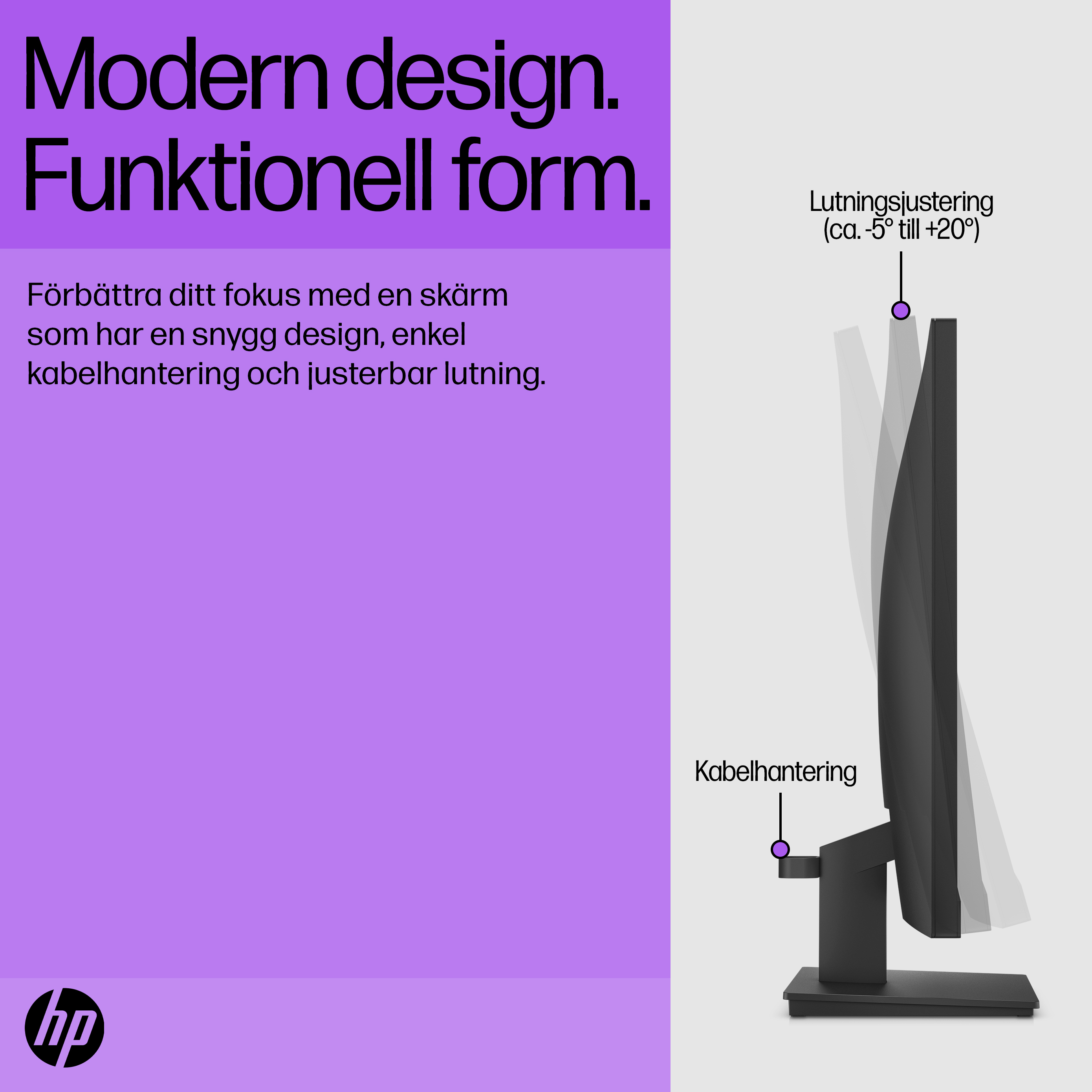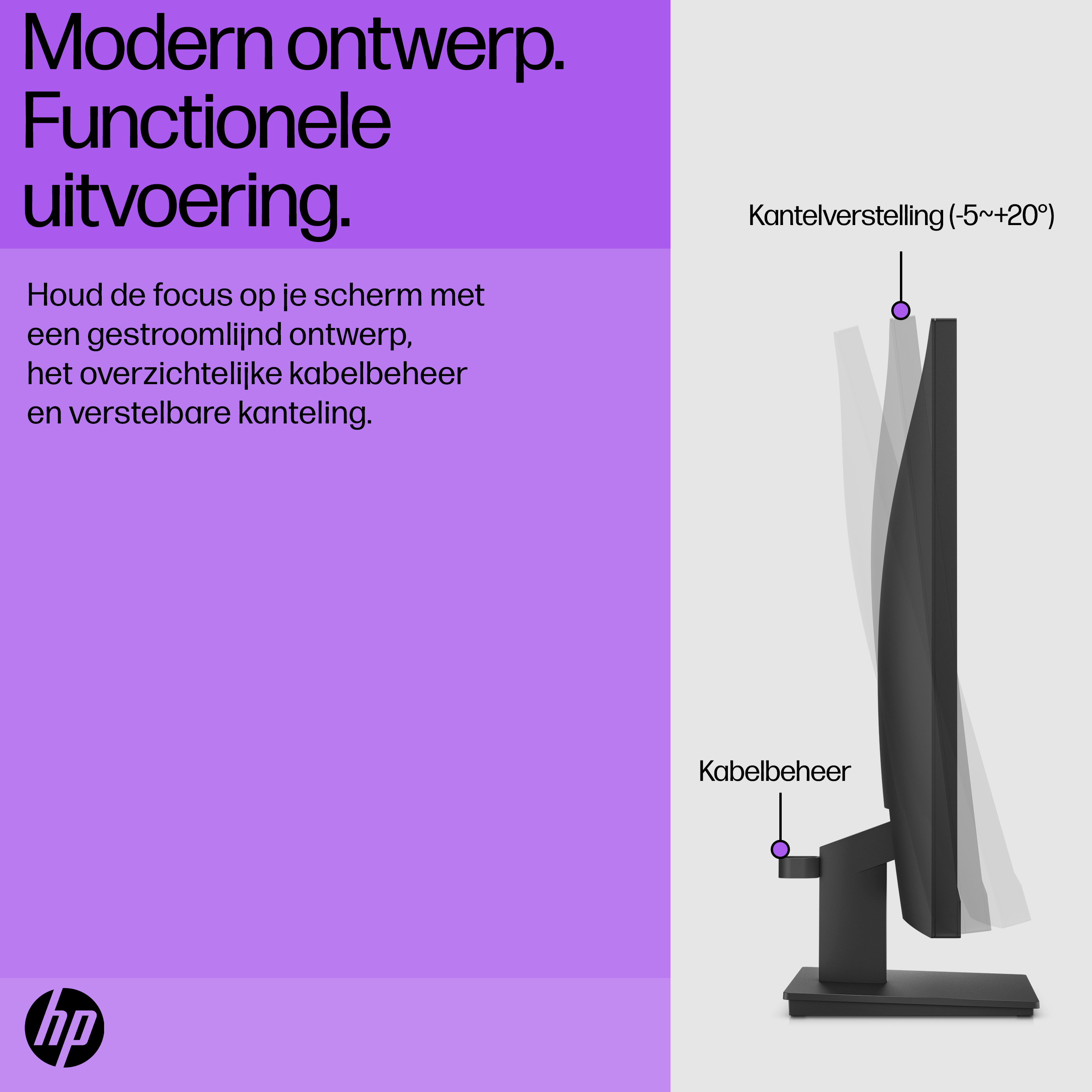 The HP P27 G5 FHD Monitor computer monitor features a modern, minimalist design with narrow bezels that maximise screen real estate and create a clean desktop aesthetic. Its matte finish reduces glare, enhancing visibility in bright office environments. The adjustable stand offers flexibility to suit individual ergonomic preferences, ensuring comfort during extended use. Overall, it combines functionality with a professional look that fits seamlessly into any workspace.