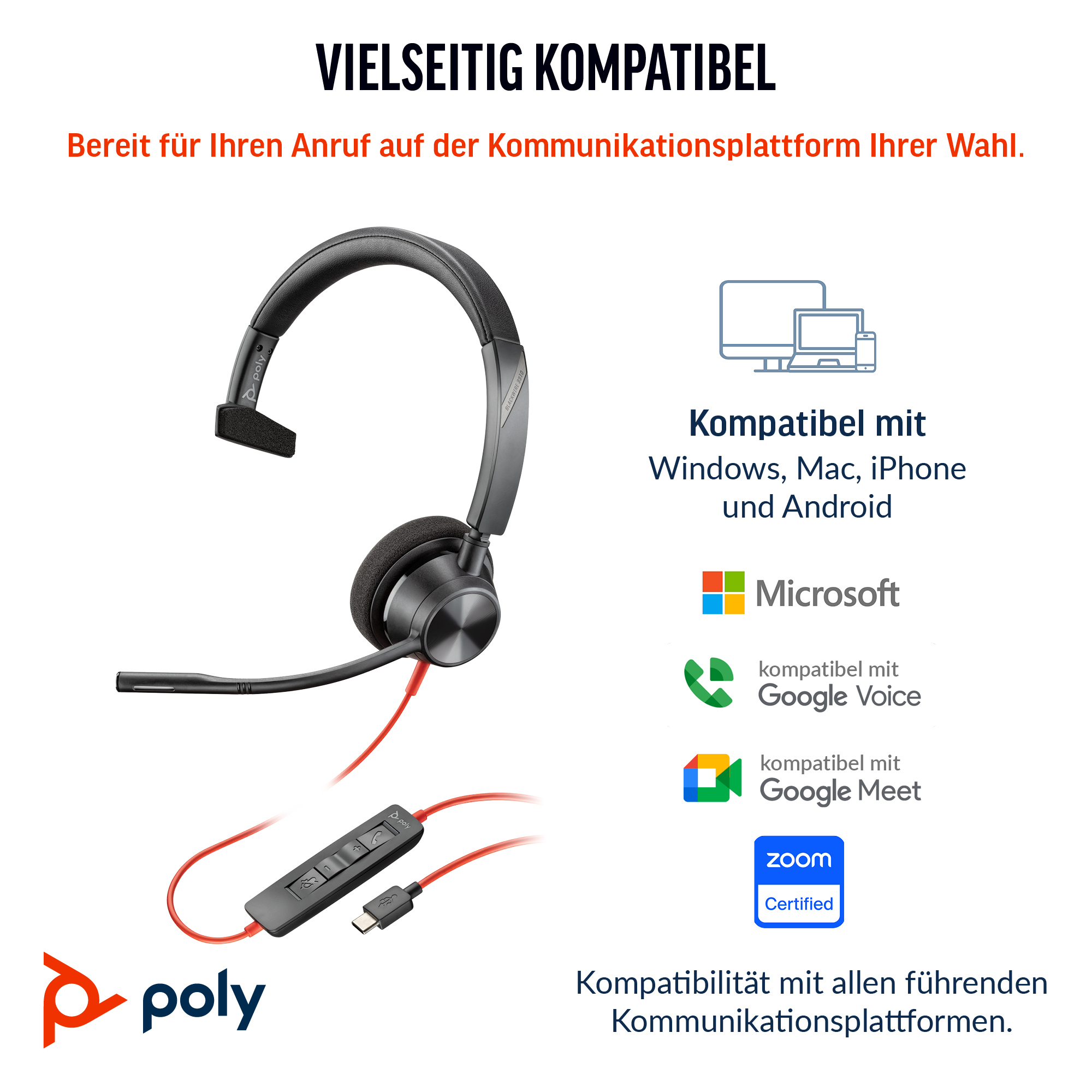 The Poly Blackwire 3310 Monaural USB-C Headset +USB-C/A Adapter boasts a sleek, professional appearance with a matte black finish that complements any office setup. Its lightweight frame and adjustable headband ensure a comfortable fit for all-day use. The single-ear design keeps users connected to their environment while maintaining focus on conversations, making it ideal for busy office or home workspaces.