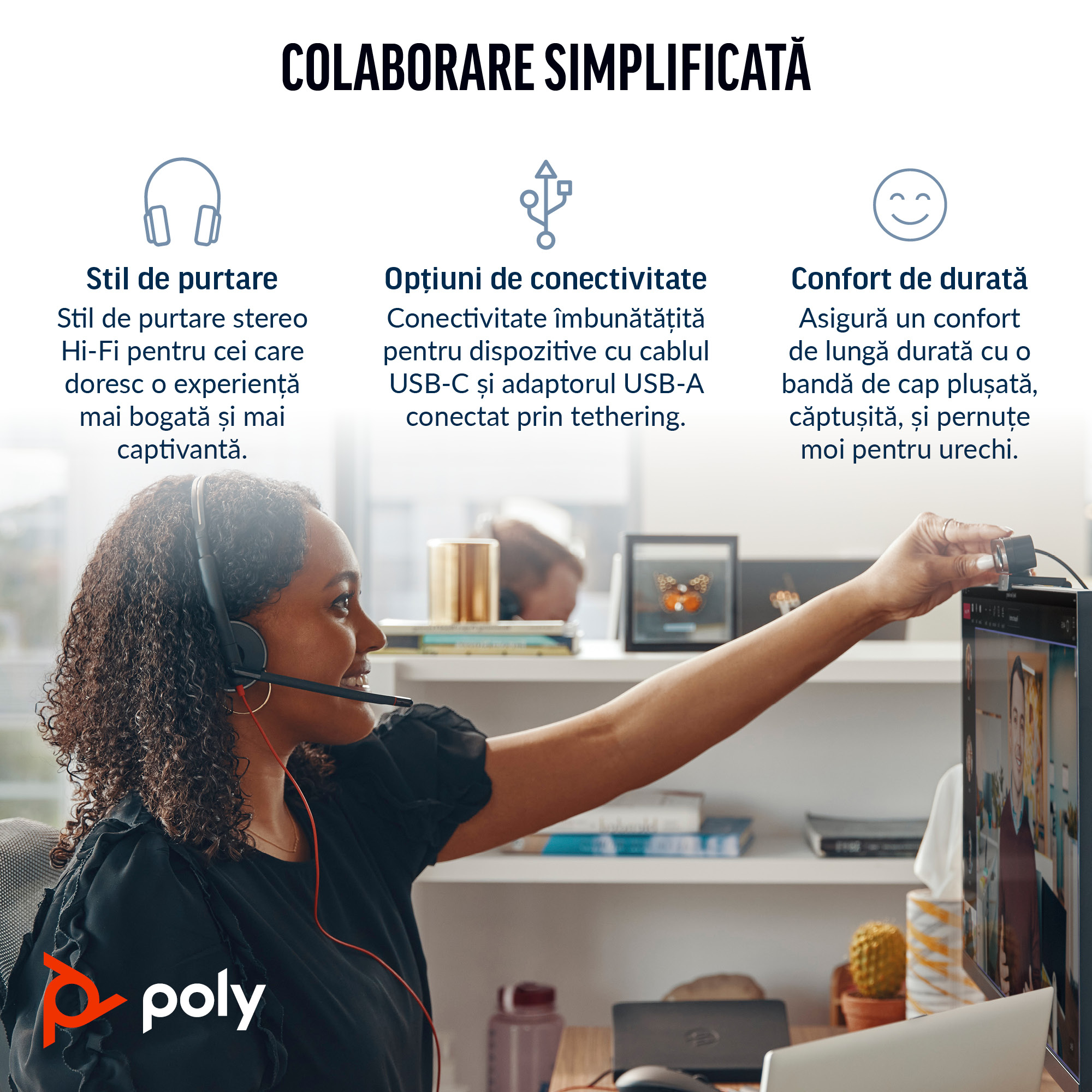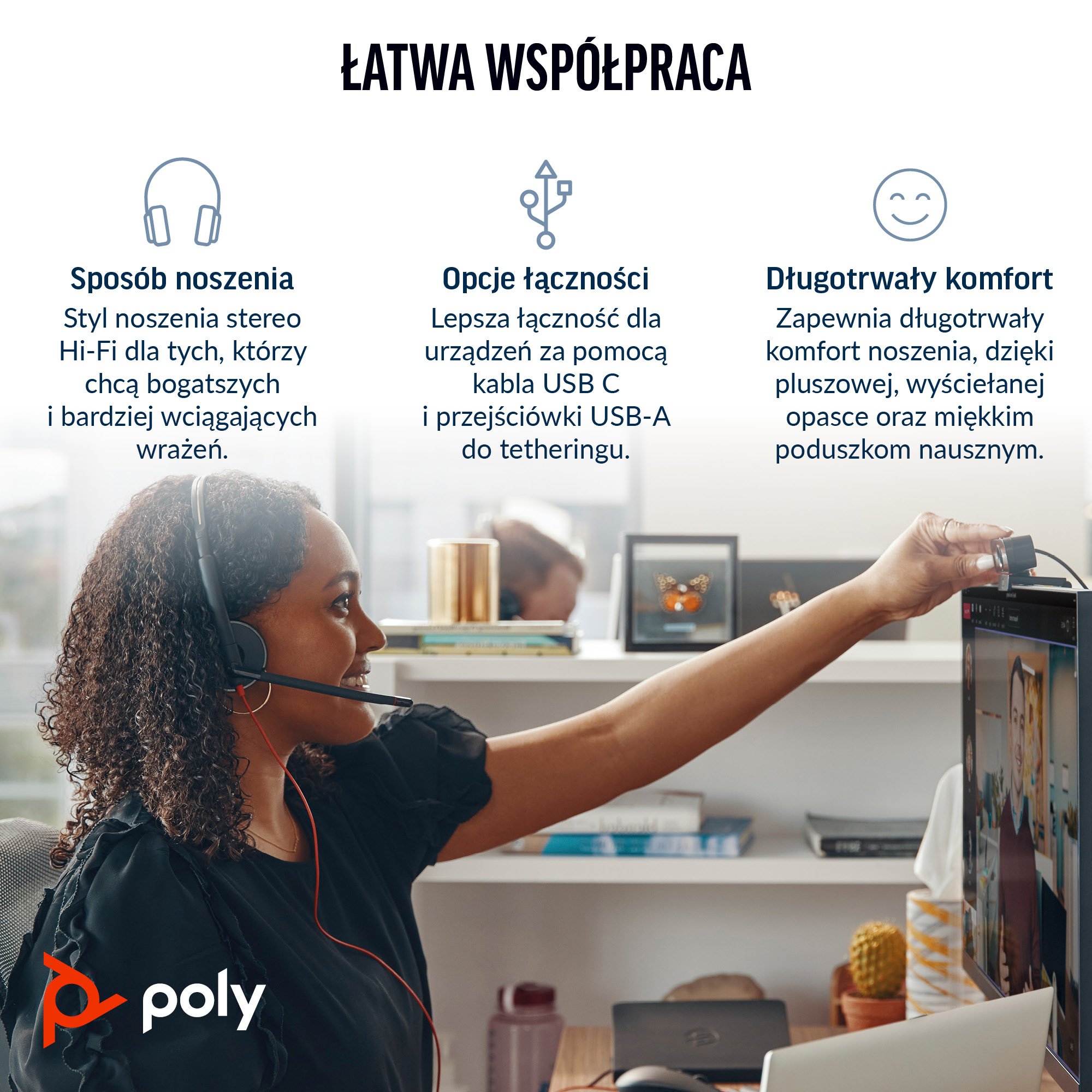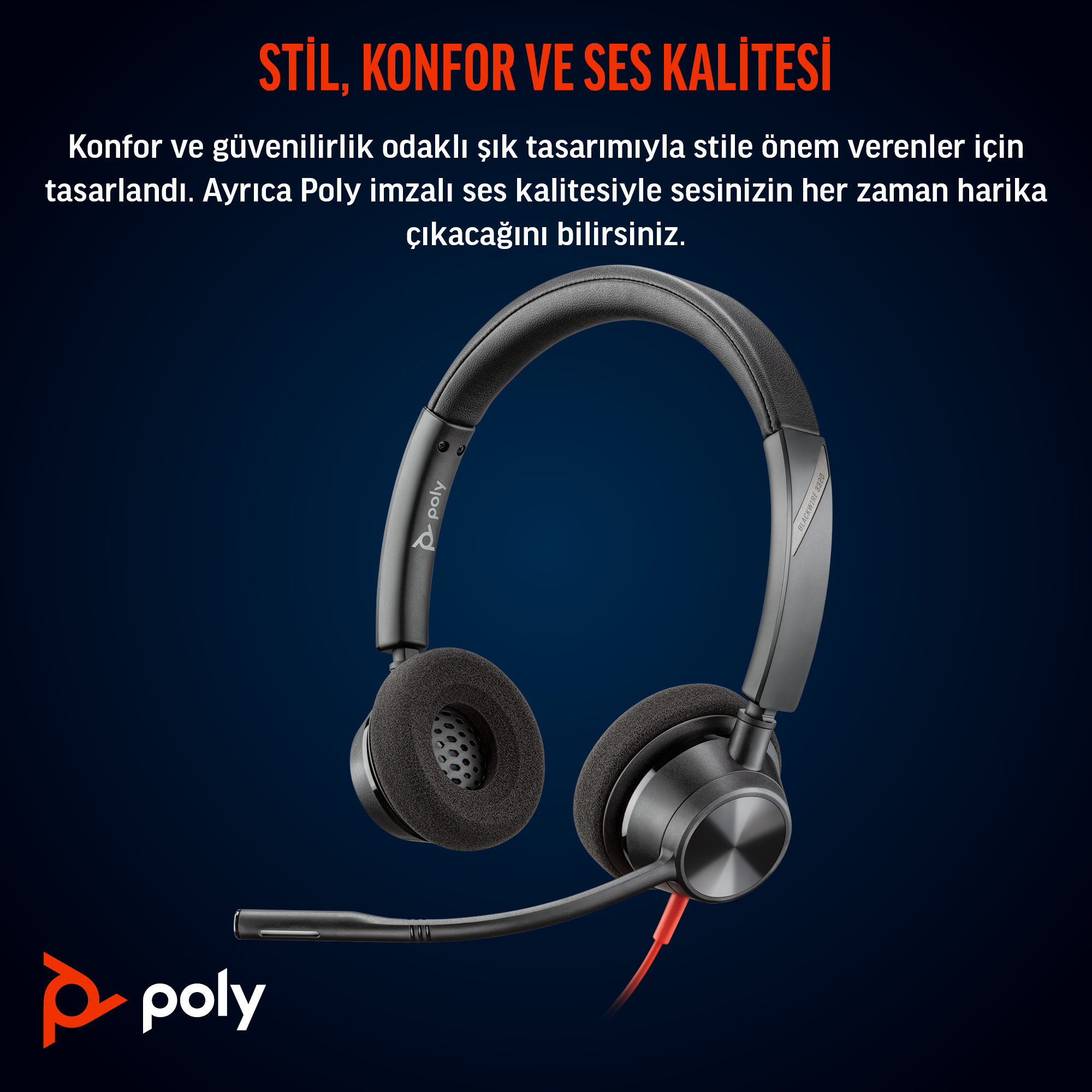 The Poly Blackwire 3320 Stereo Microsoft Teams Certified USB-C Headset +USB-C/A Adapter features a sleek, professional design with a lightweight headband and soft ear cushions for extended comfort. Its minimalist aesthetic fits well in any office or home workspace, while the adjustable microphone boom ensures optimal positioning. The durable materials and robust build quality reflect Poly’s commitment to reliability and user satisfaction.