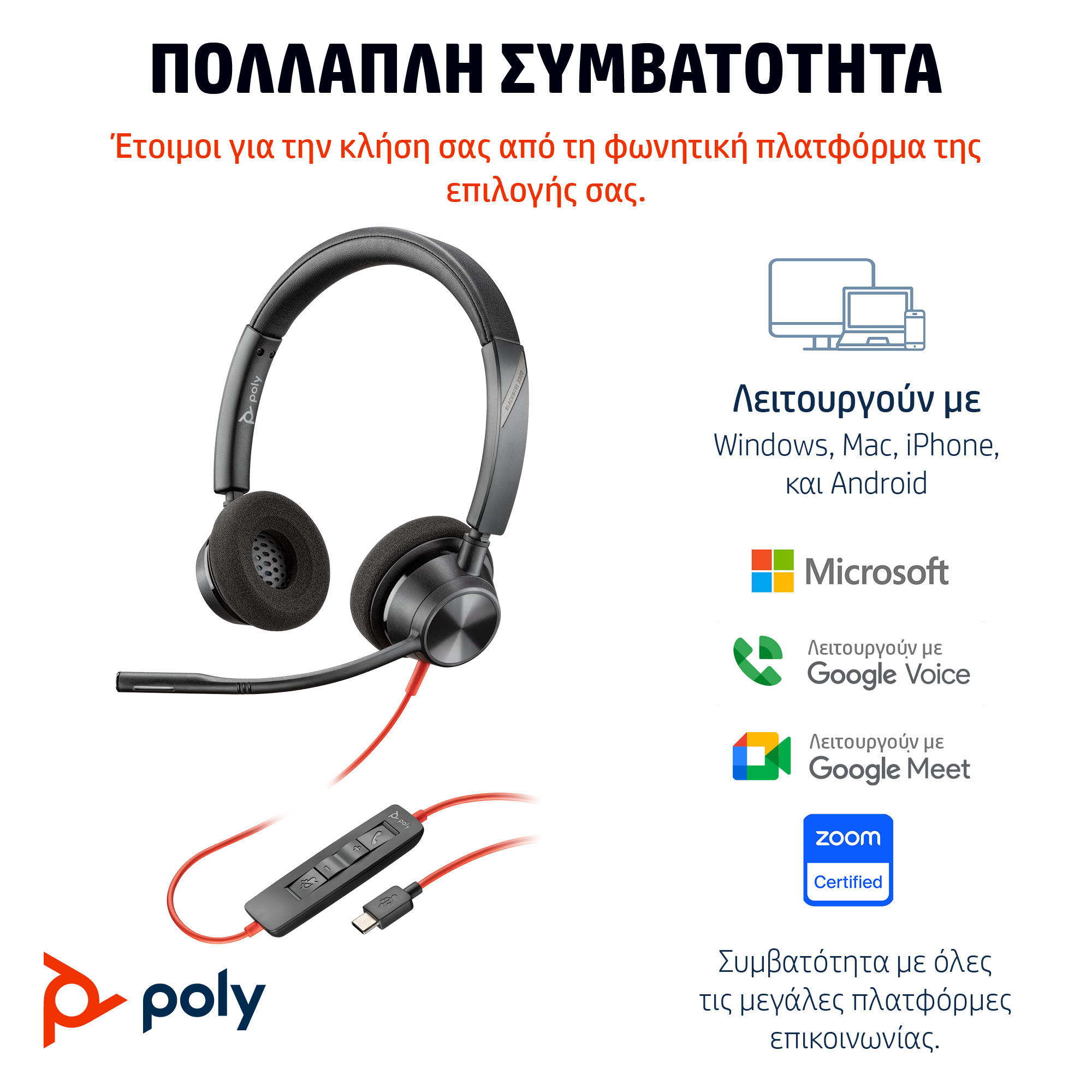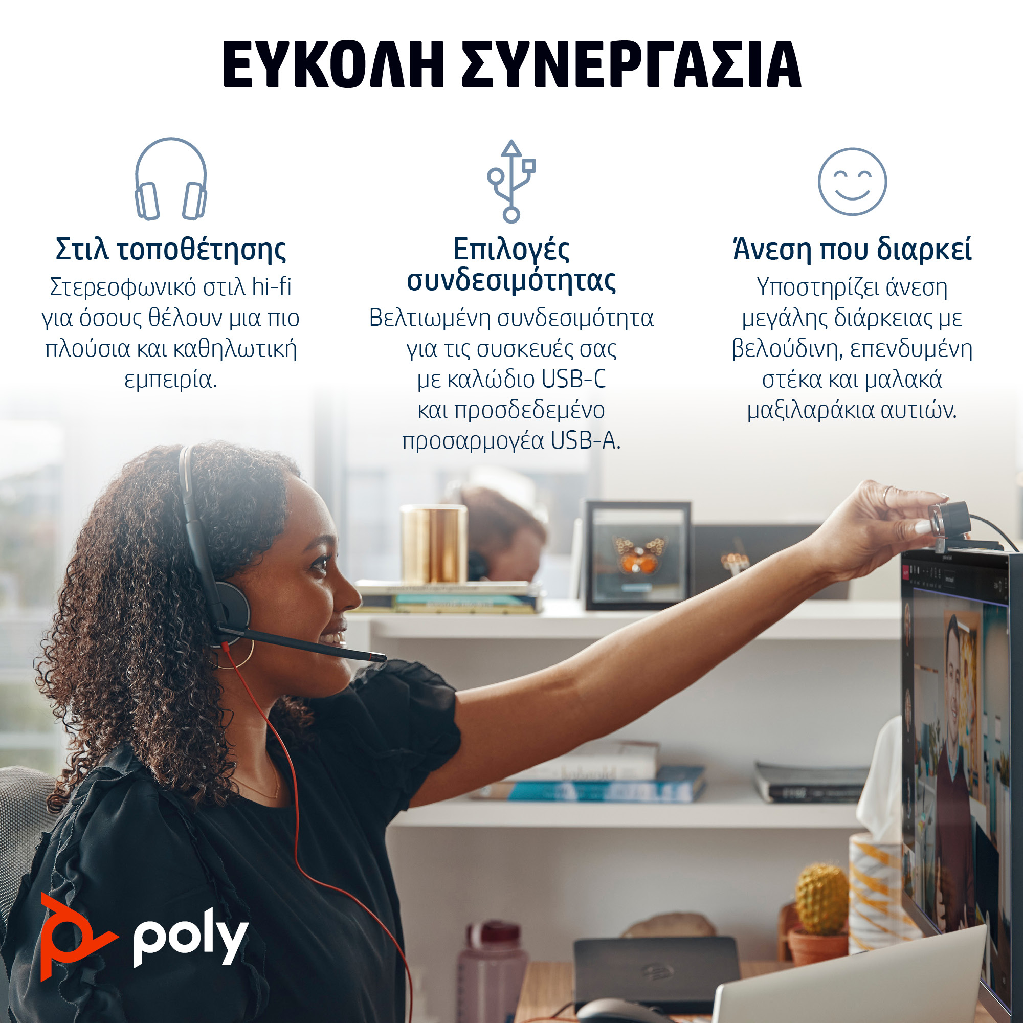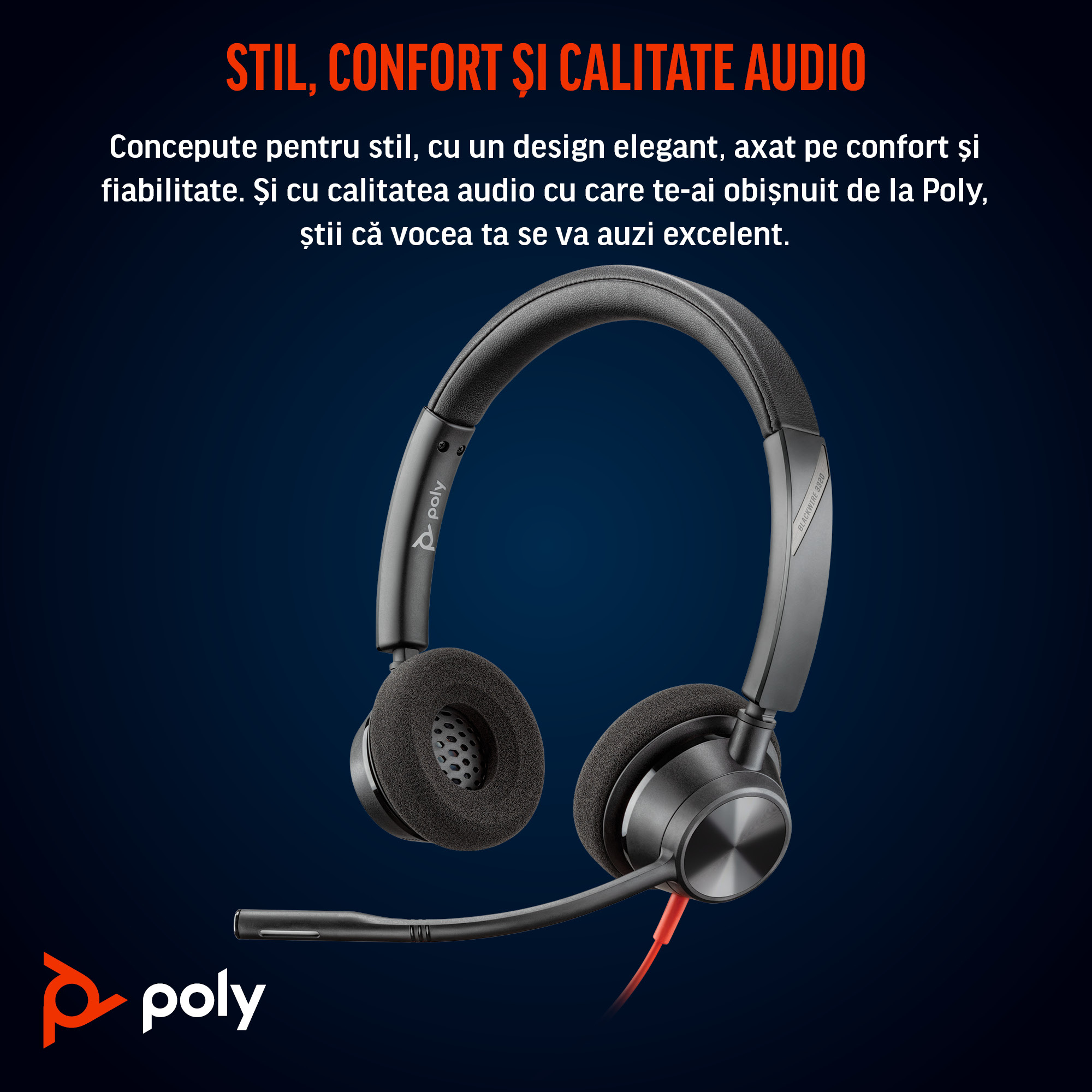 The Poly Blackwire 3320 Stereo Microsoft Teams Certified USB-C Headset +USB-C/A Adapter features a sleek, professional design with a lightweight headband and soft ear cushions for extended comfort. Its minimalist aesthetic fits well in any office or home workspace, while the adjustable microphone boom ensures optimal positioning. The durable materials and robust build quality reflect Poly’s commitment to reliability and user satisfaction.