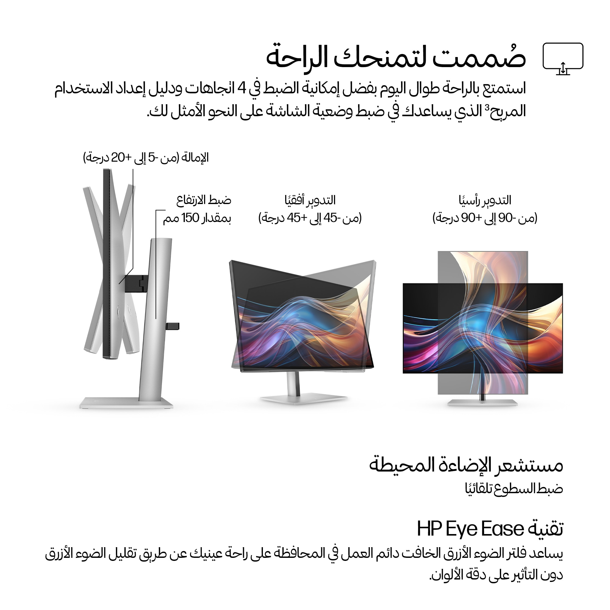 - Ergonomic stand with height, tilt, and swivel adjustments ensures comfortable viewing for extended work hours.