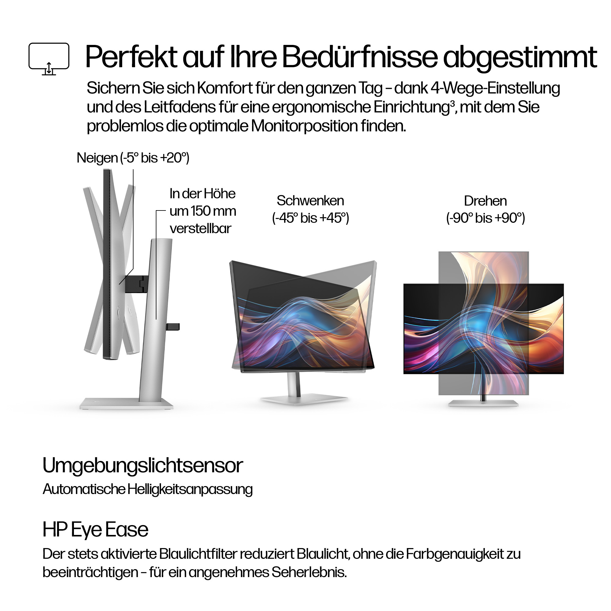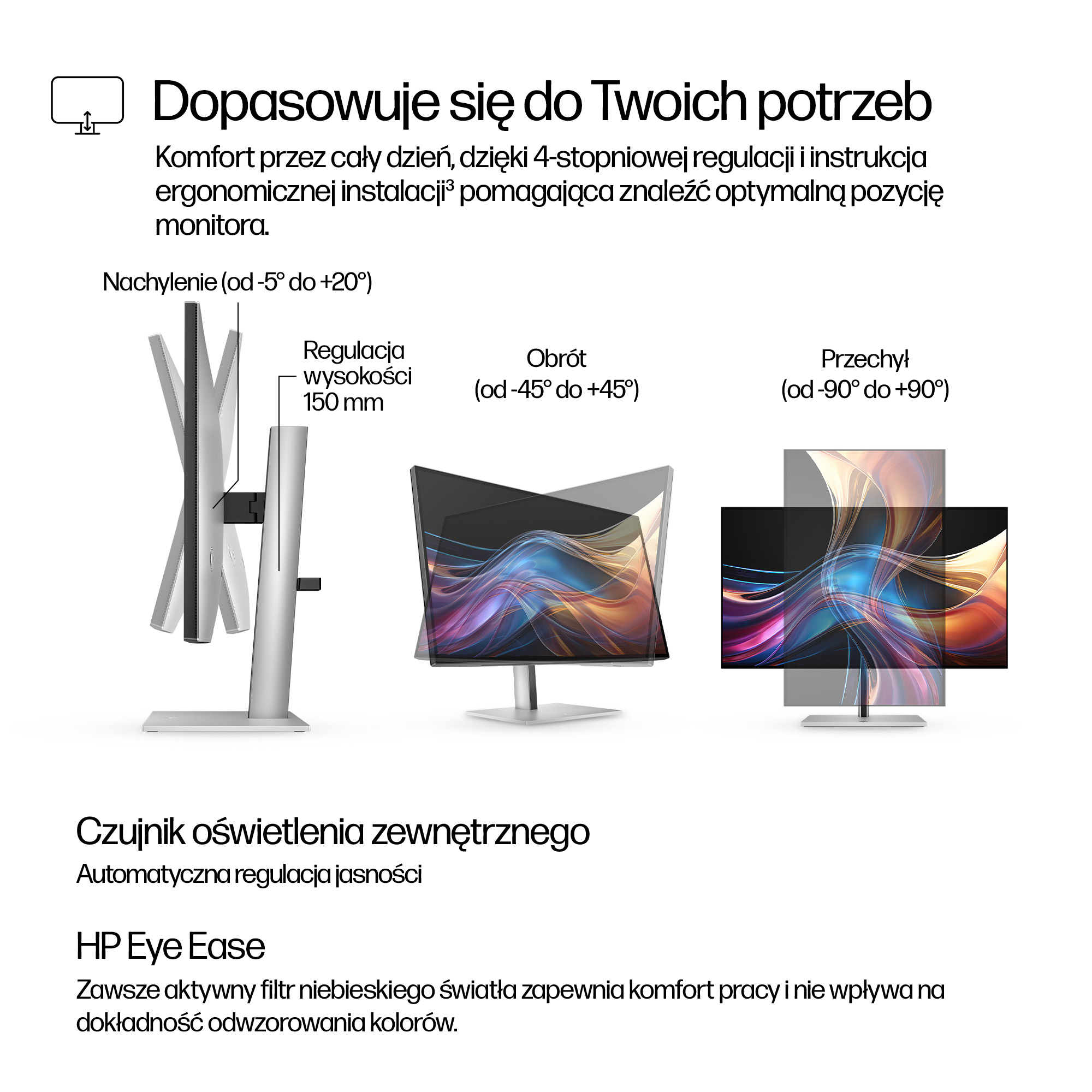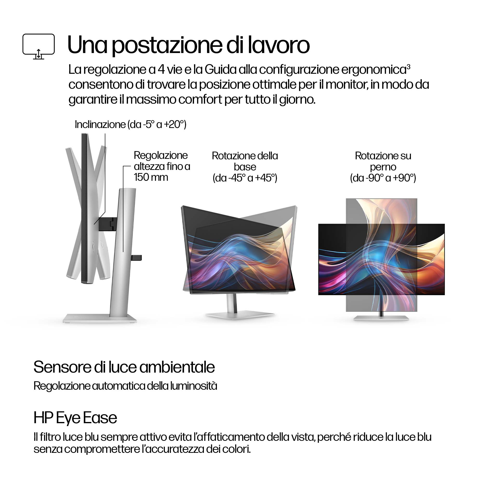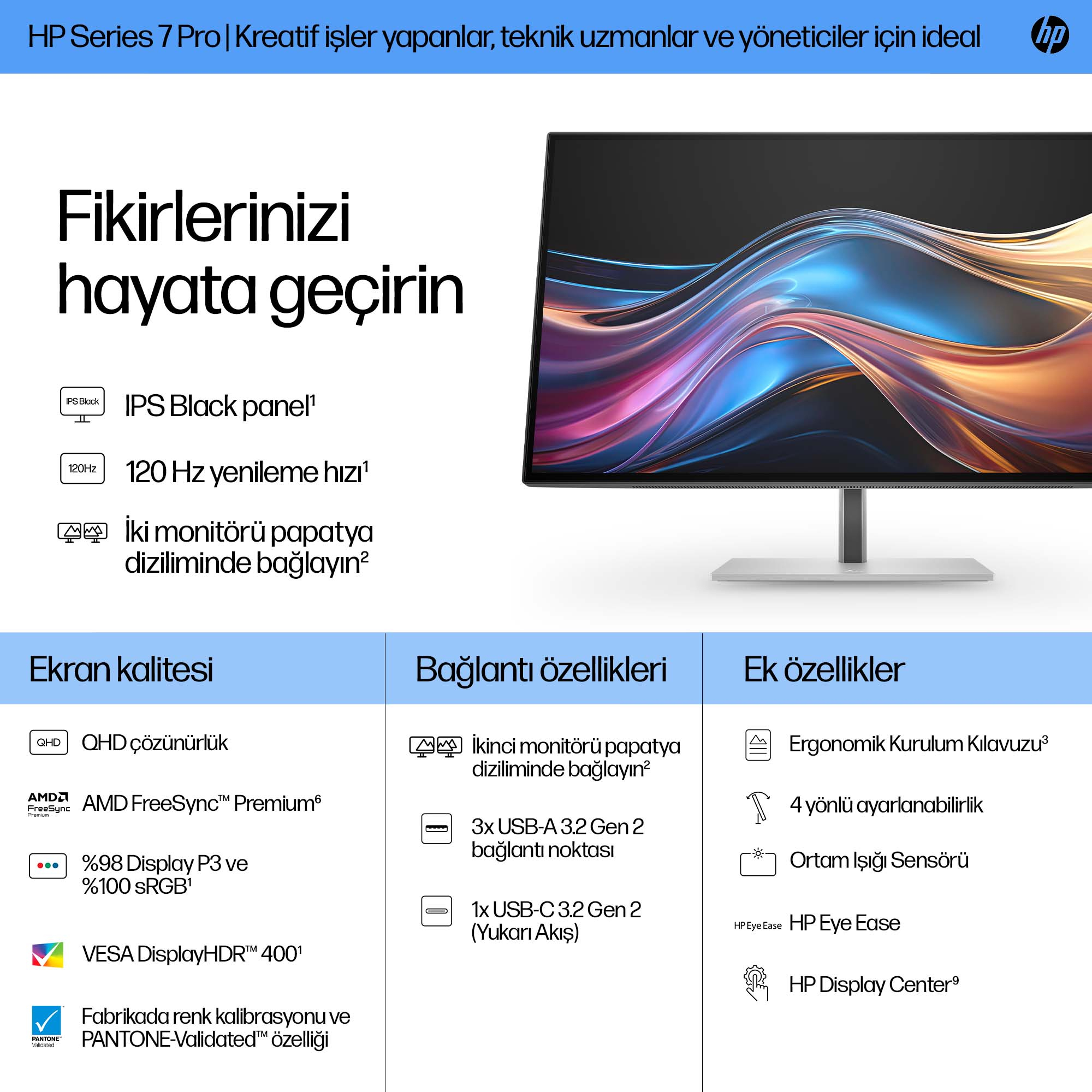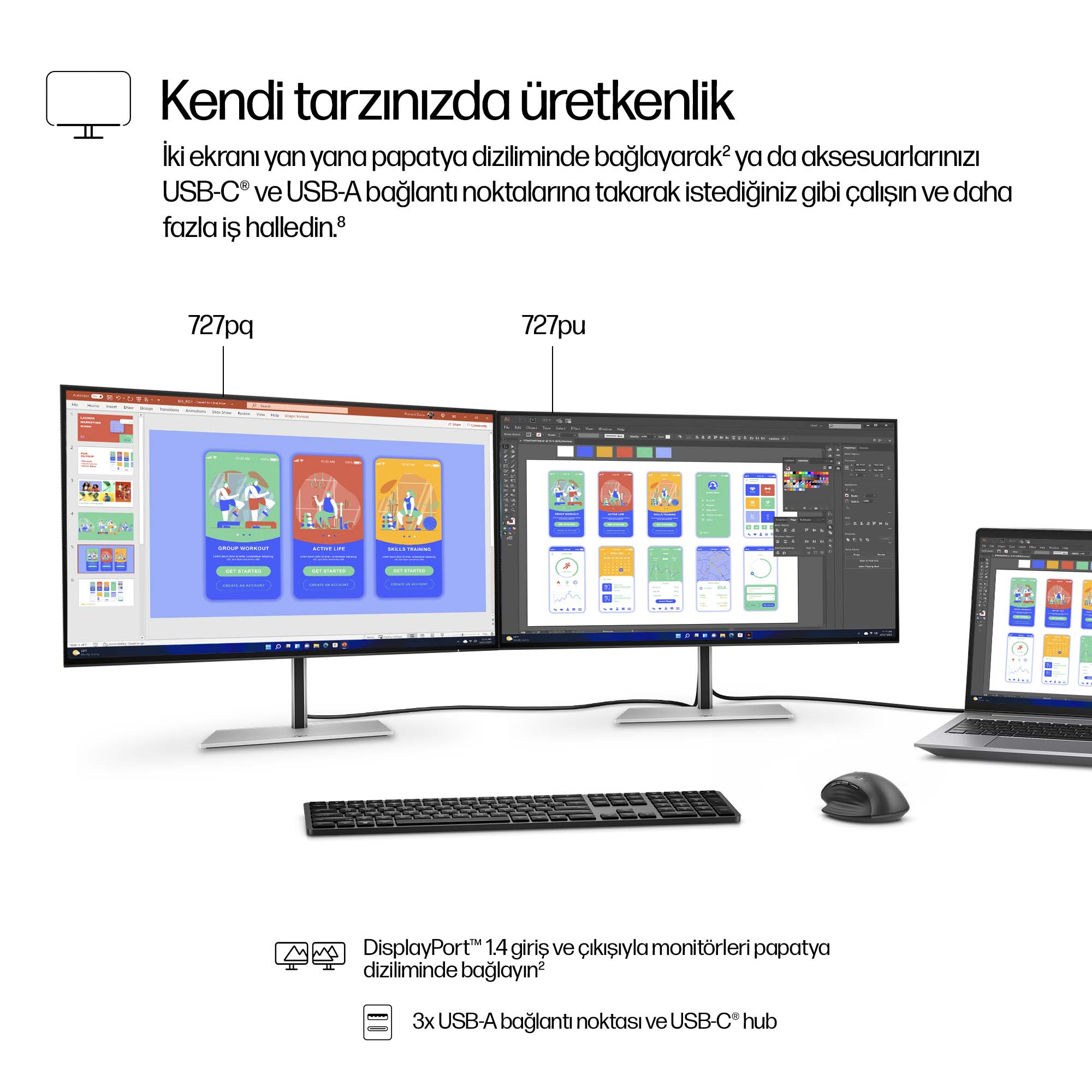 The HP Series 7 Pro 27 inch QHD Monitor – 727pq computer monitor features a sleek, modern design with narrow bezels that maximise screen space and minimise distractions. Its matte black finish complements professional office environments, while the sturdy adjustable stand provides stability and ergonomic flexibility. The overall build quality reflects HP’s commitment to durability and user comfort.