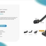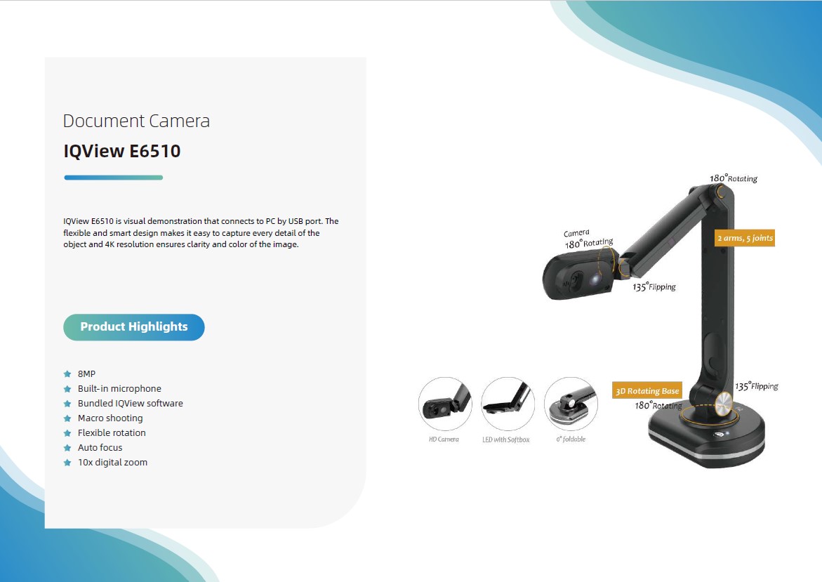 The IQTouch IQView Document Camera E6510 boasts a sleek, professional design with a matte black finish that complements any office environment. Its flexible arm and compact base provide both stability and versatility, allowing users to position the camera precisely. Lightweight yet robust, the device is easy to transport between meeting rooms or remote locations without compromising durability or style.