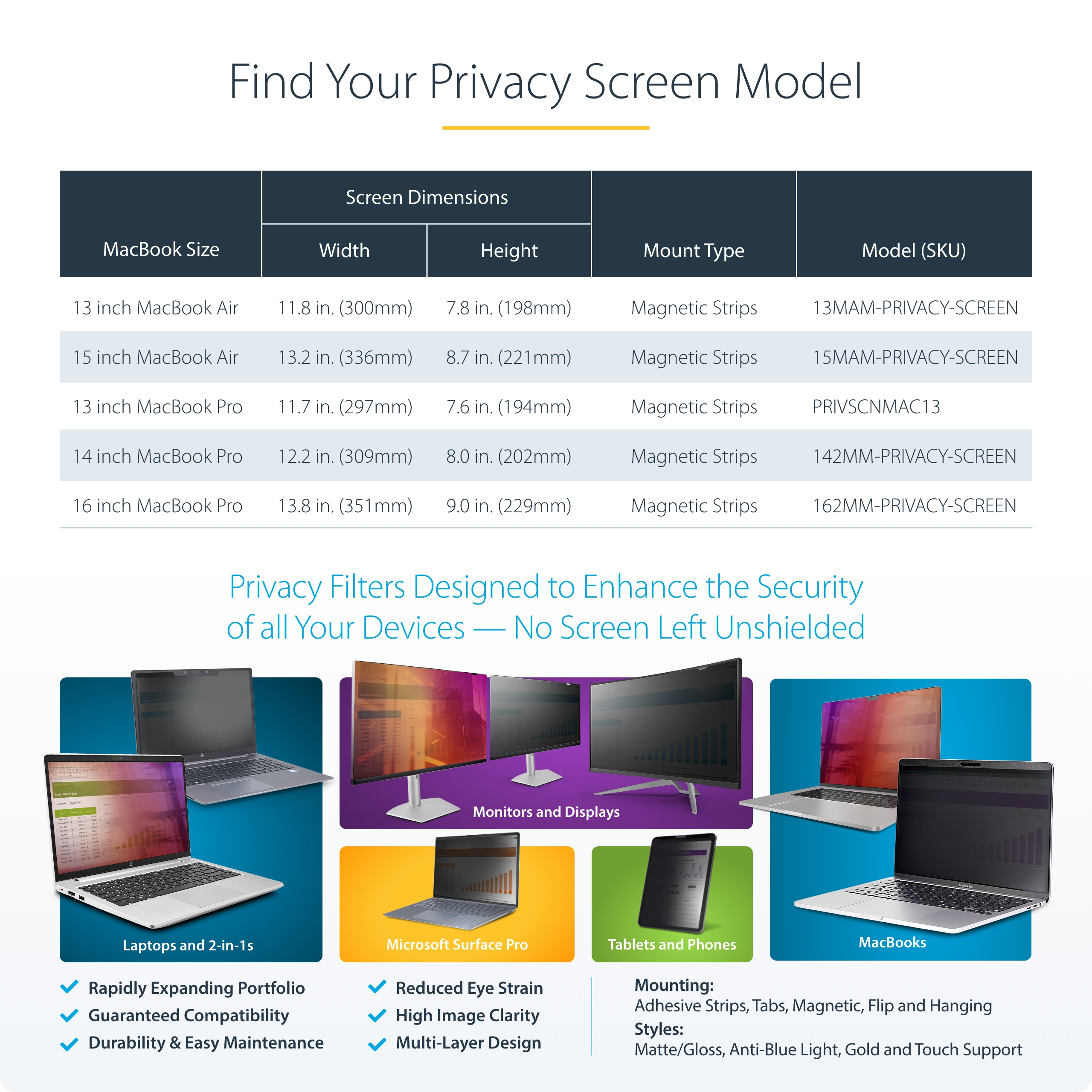 The StarTech.com 13MAM-PRIVACY-SCREEN display privacy filter features a sleek, matte finish that blends seamlessly with modern laptop and monitor designs. Its slim profile ensures it does not add bulk, maintaining the device’s original aesthetics. The filter’s surface is smooth to the touch, providing a premium feel while remaining highly functional. Its understated design makes it suitable for professional environments without drawing unnecessary attention.