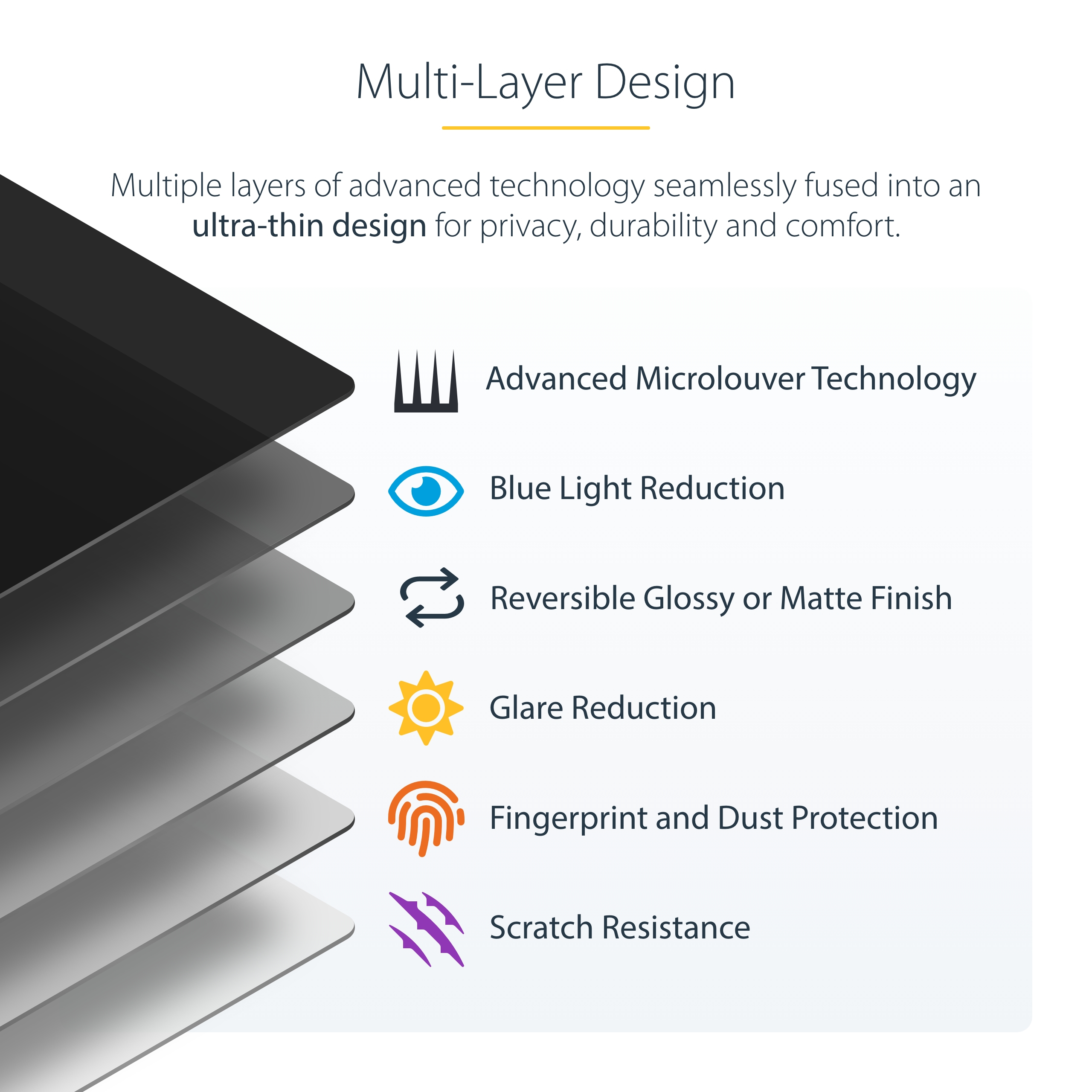 - The privacy filter utilises micro-louver technology to limit viewing angles, effectively preventing side glances and shoulder surfing in open-plan offices or public spaces.