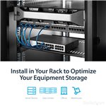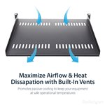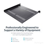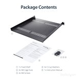 - The StarTech.com CABSHELF116V rack accessory features a robust steel frame with a black powder-coated finish, providing corrosion resistance and a professional appearance.