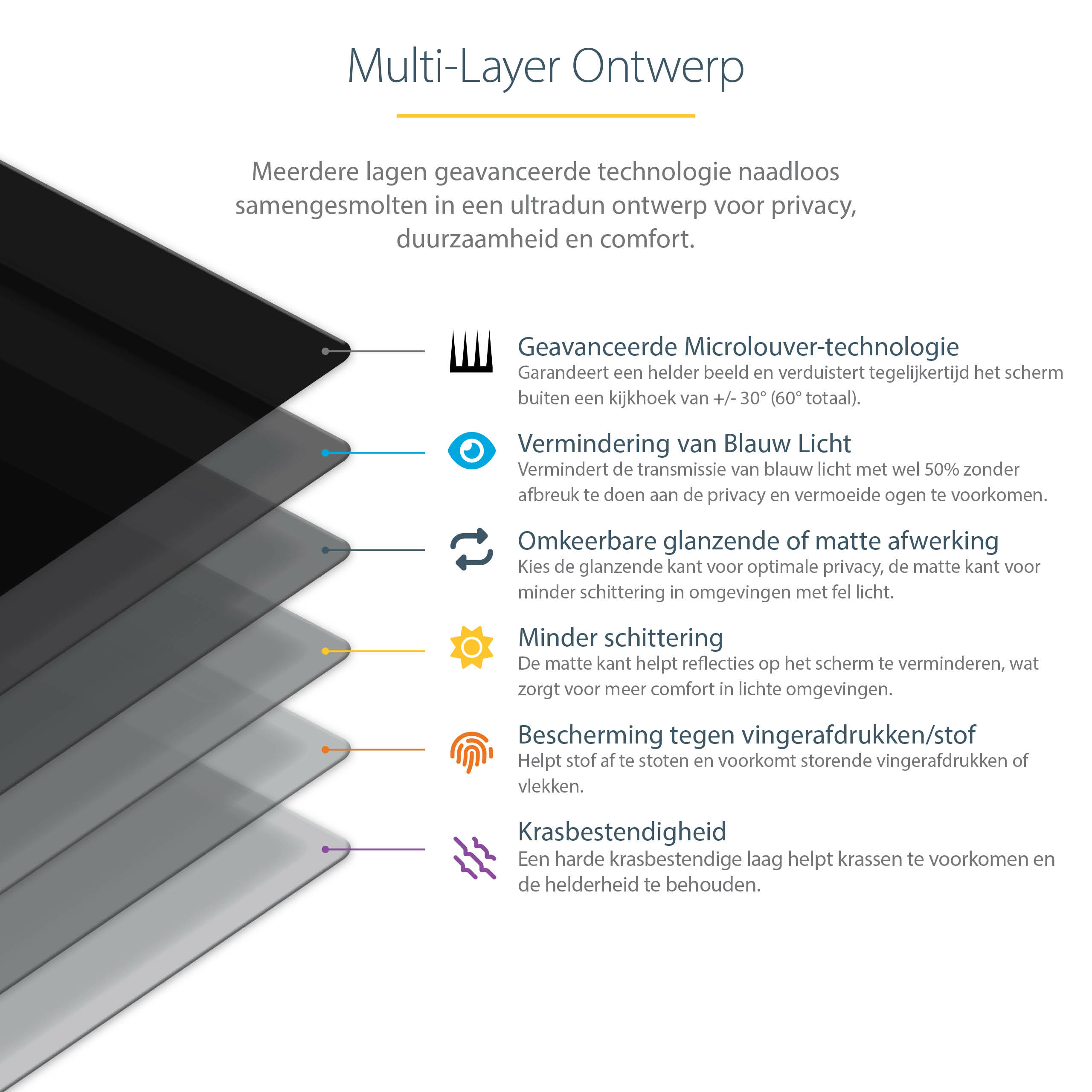 - Utilises micro-louver technology to block side views, ensuring confidential data remains secure in open-plan offices or public areas.
