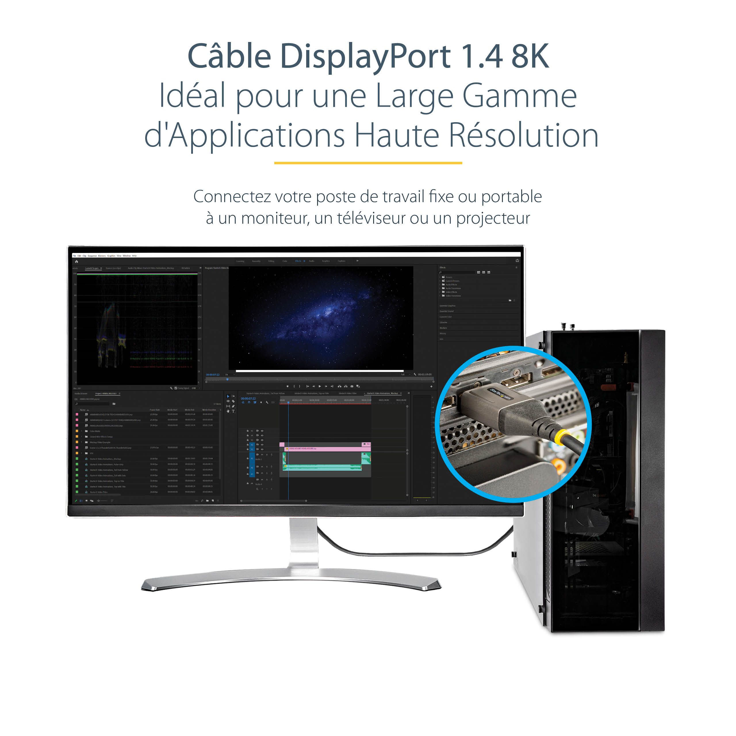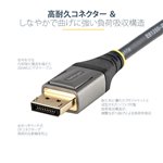 The StarTech.com DP14VMM3M DisplayPort cable features a sleek, professional design with robust connectors that provide a secure fit. Its flexible yet sturdy cable jacket allows for easy routing and installation in tight spaces. The cable’s understated black finish complements any modern office setup, maintaining a clean and organized workspace aesthetic.