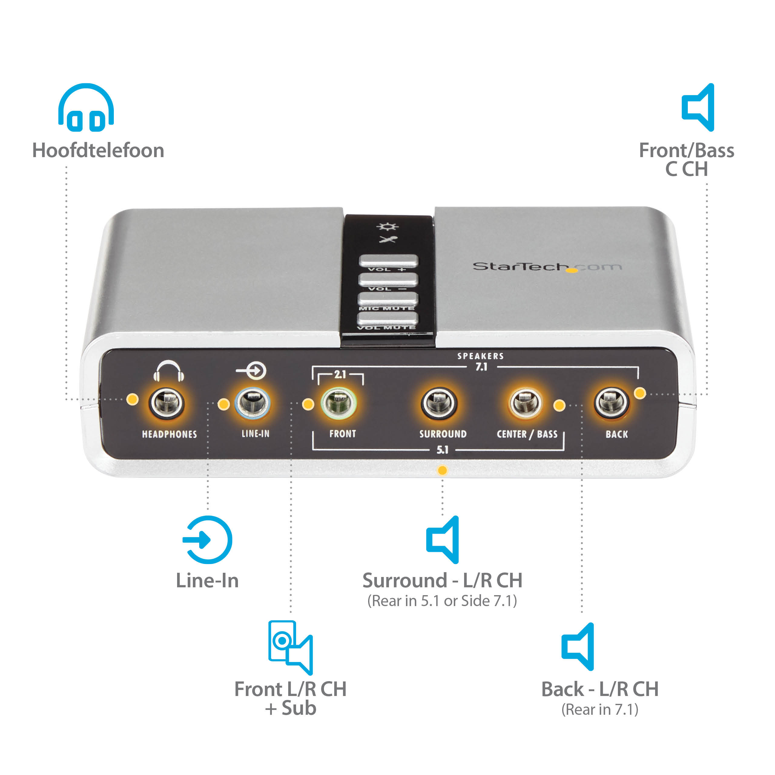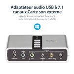 - The StarTech.com ICUSBAUDIO7D audio card supports 7.1 surround sound, enhancing multimedia presentations and virtual meetings.
