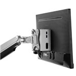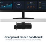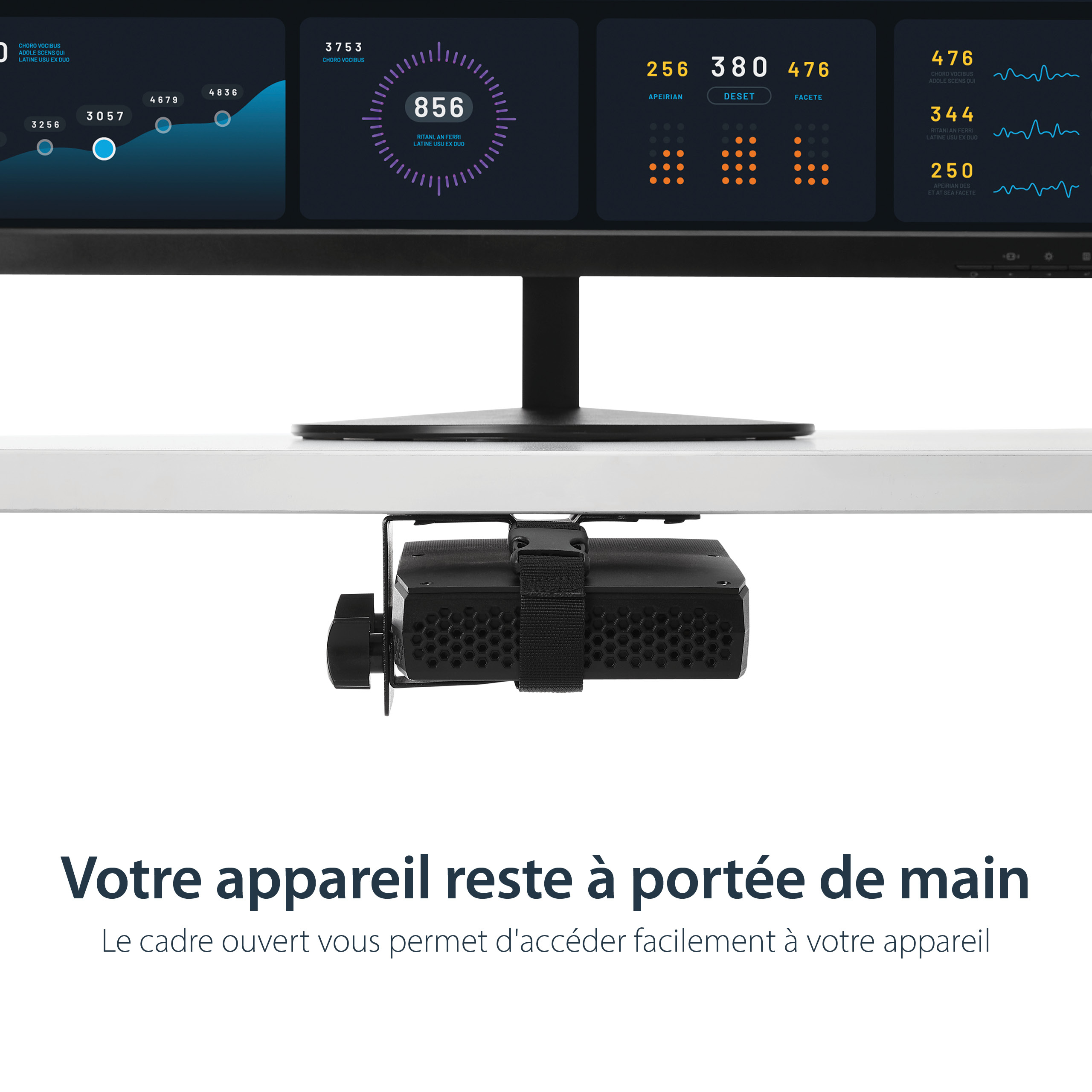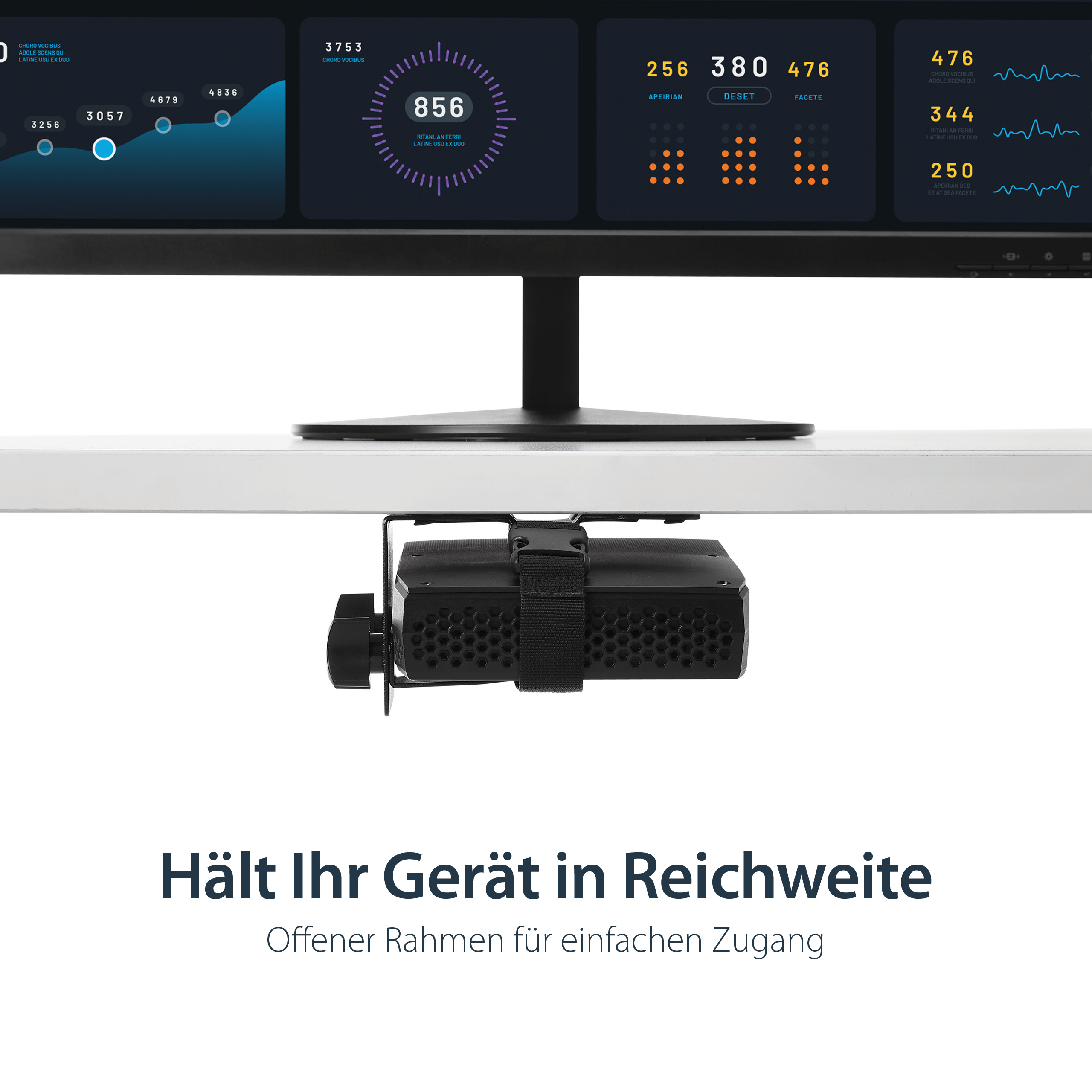 The StarTech.com ACCSMNT CPU holder boasts a sleek, minimalist design that blends seamlessly into any office environment. Its matte black finish complements modern office furniture while providing a discreet yet sturdy mounting solution. The holder’s compact form factor ensures it does not interfere with legroom, maintaining user comfort and workspace efficiency.