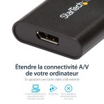 The StarTech.com USB32DPES2 USB graphics adapter features a sleek, compact design that fits easily into any workspace without clutter. Its lightweight build makes it highly portable for on-the-go professionals. The robust casing ensures durability, while the intuitive plug-and-play setup reflects a user-friendly approach tailored for busy IT teams.