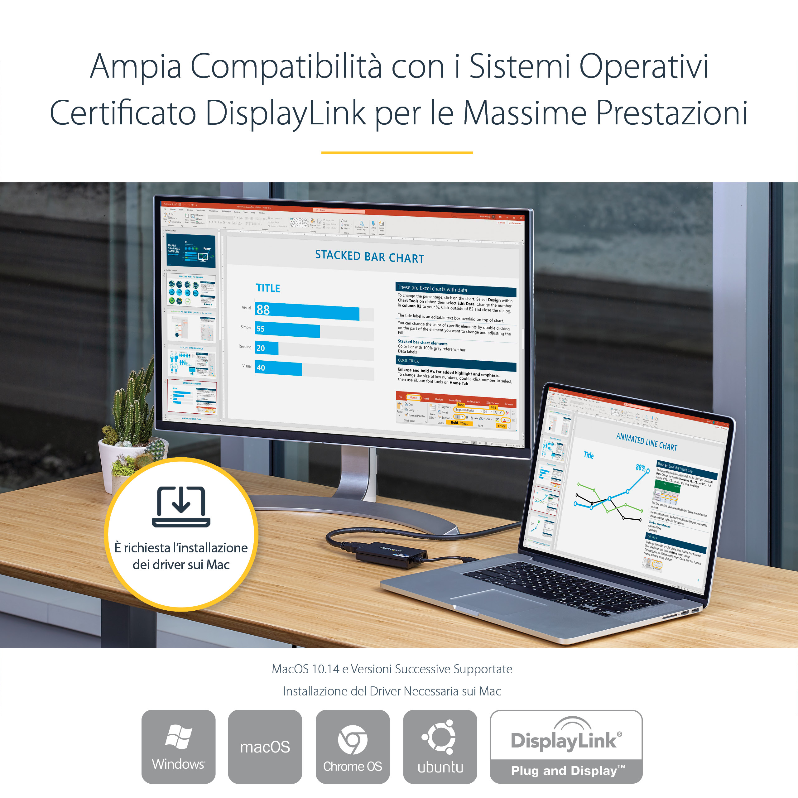 • Utilises DisplayLink technology to deliver high-quality video output over USB, enabling multiple monitor setups without additional GPU hardware.