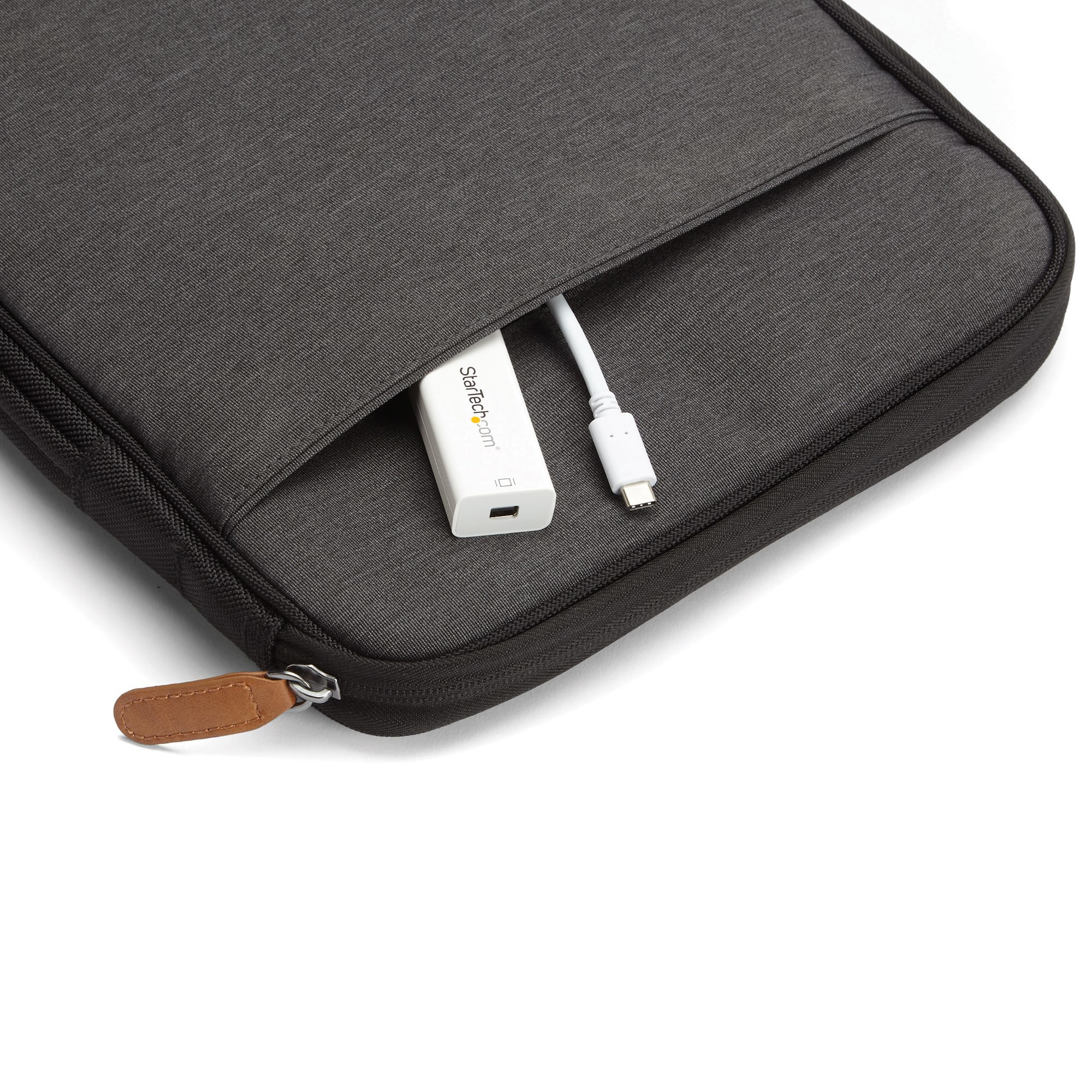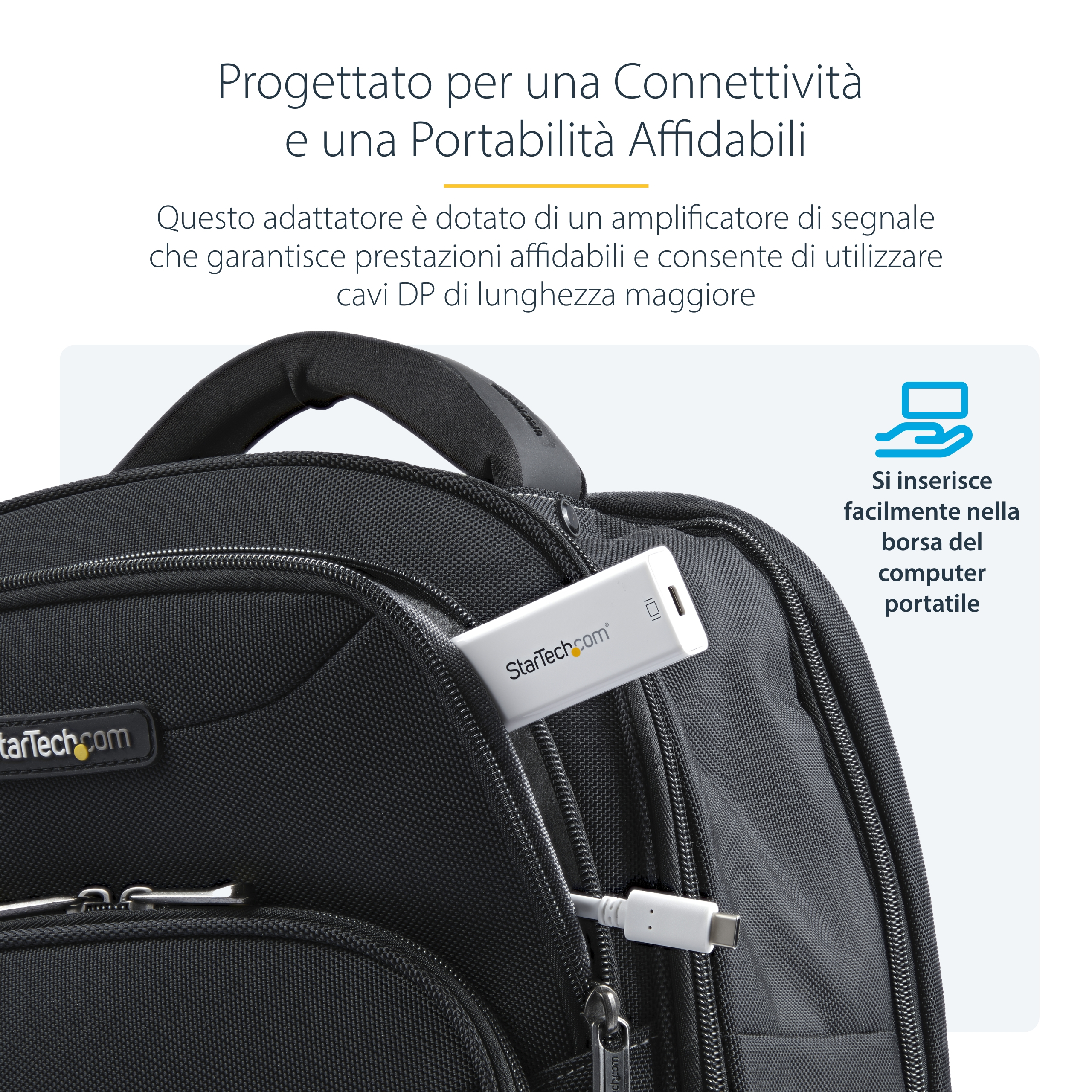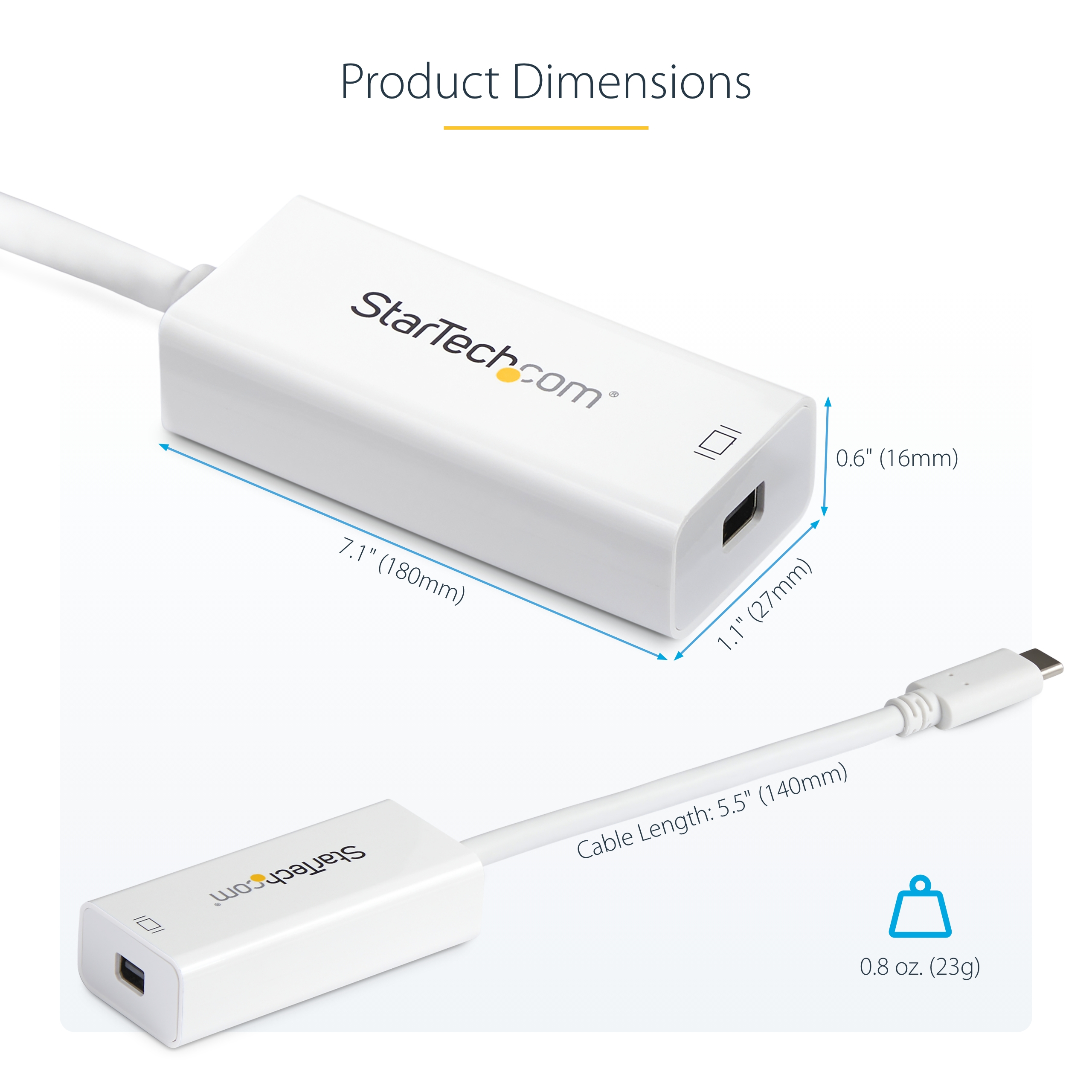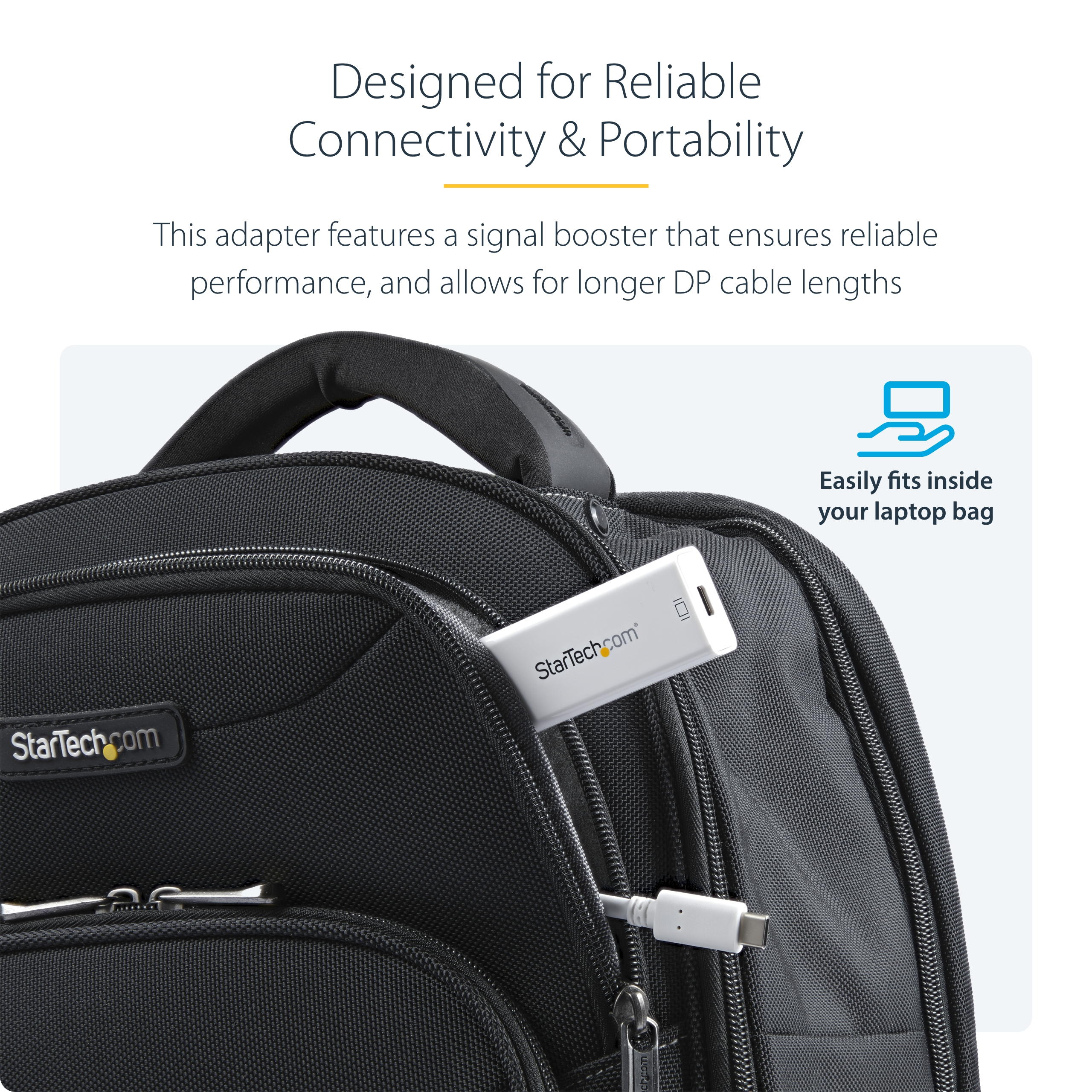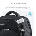 The StarTech.com CDP2MDP USB graphics adapter features a sleek, minimalist design that fits effortlessly into any professional workspace. Its lightweight and compact form factor make it highly portable, while the robust casing ensures durability. The neutral black finish complements modern office aesthetics, providing a professional look without drawing unnecessary attention.