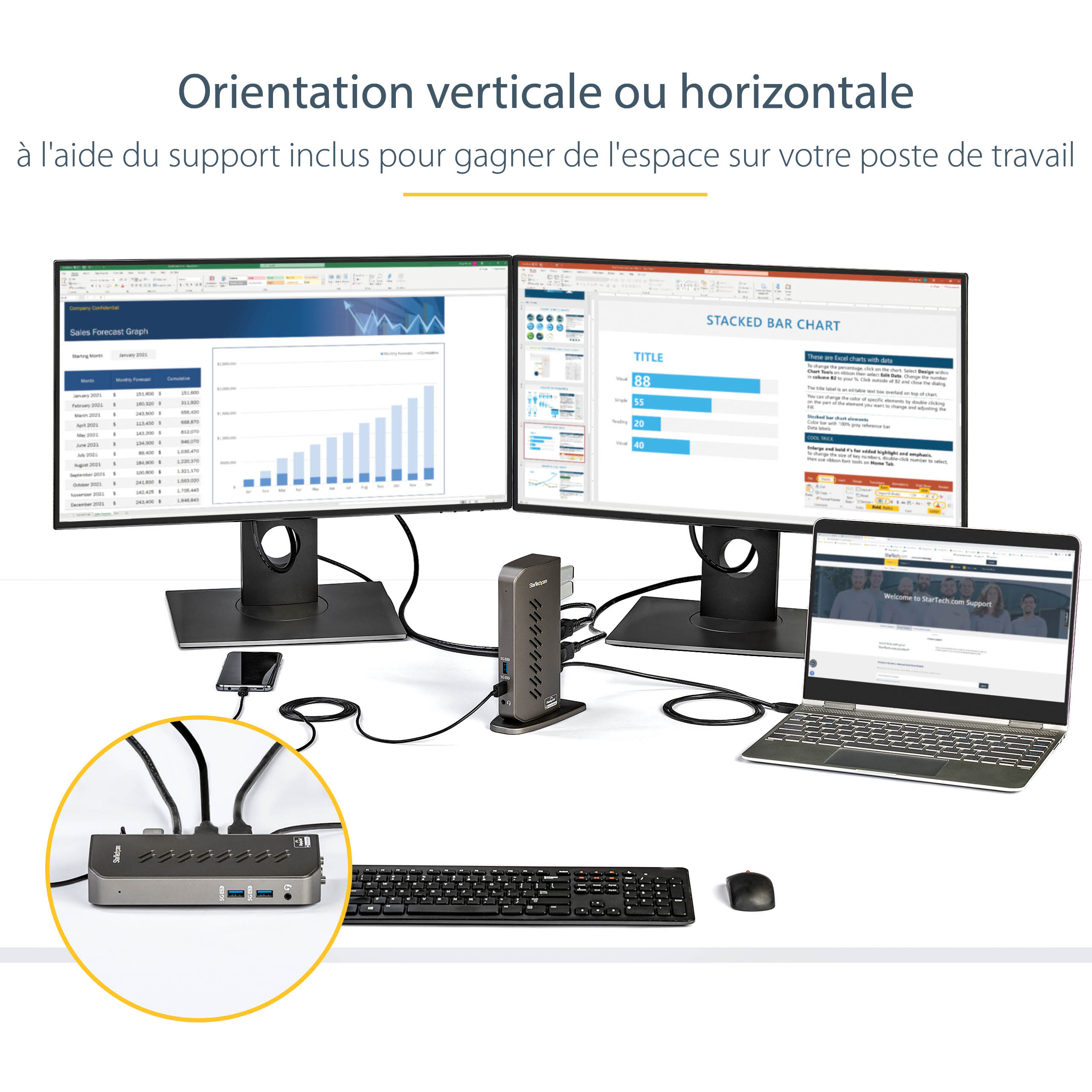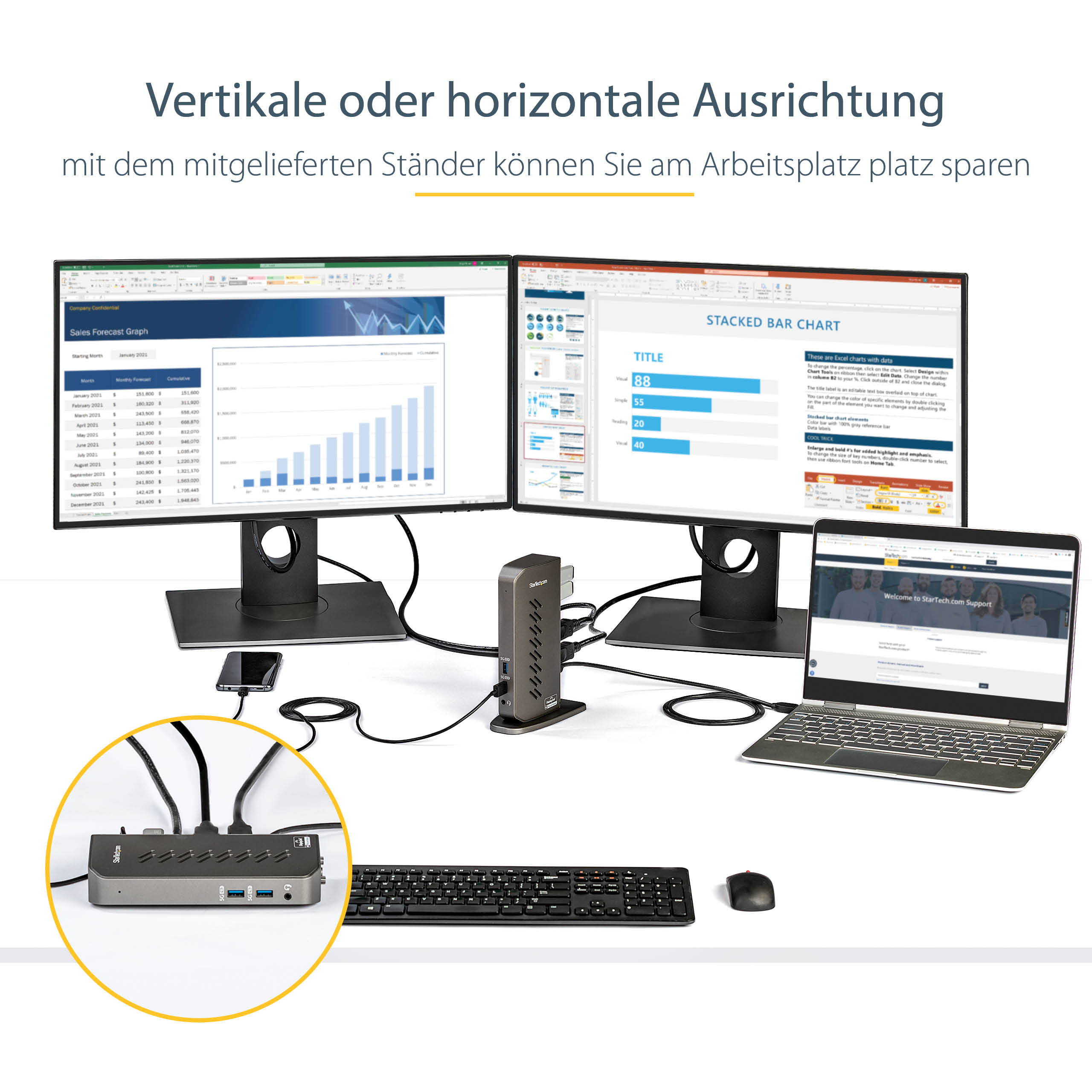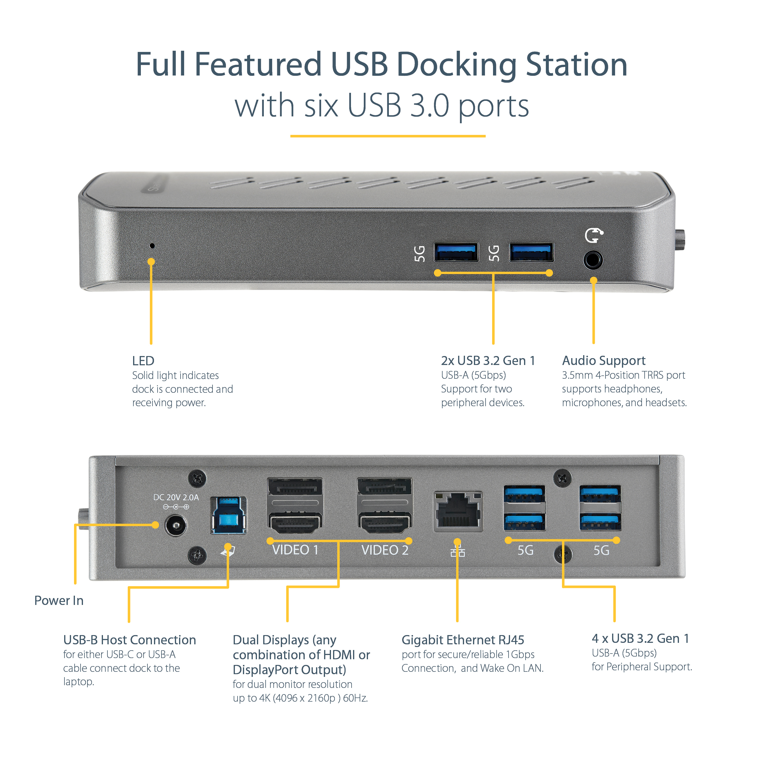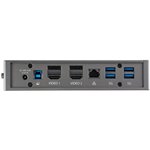 The StarTech.com DK30A2DHU laptop dock/port replicator features a sleek, matte black finish that complements professional office environments. Its compact footprint ensures it fits comfortably on desks without occupying excessive space. The sturdy build quality reflects durability, making it suitable for daily use in busy workspaces. Thoughtful port placement enhances cable management and accessibility.
