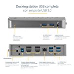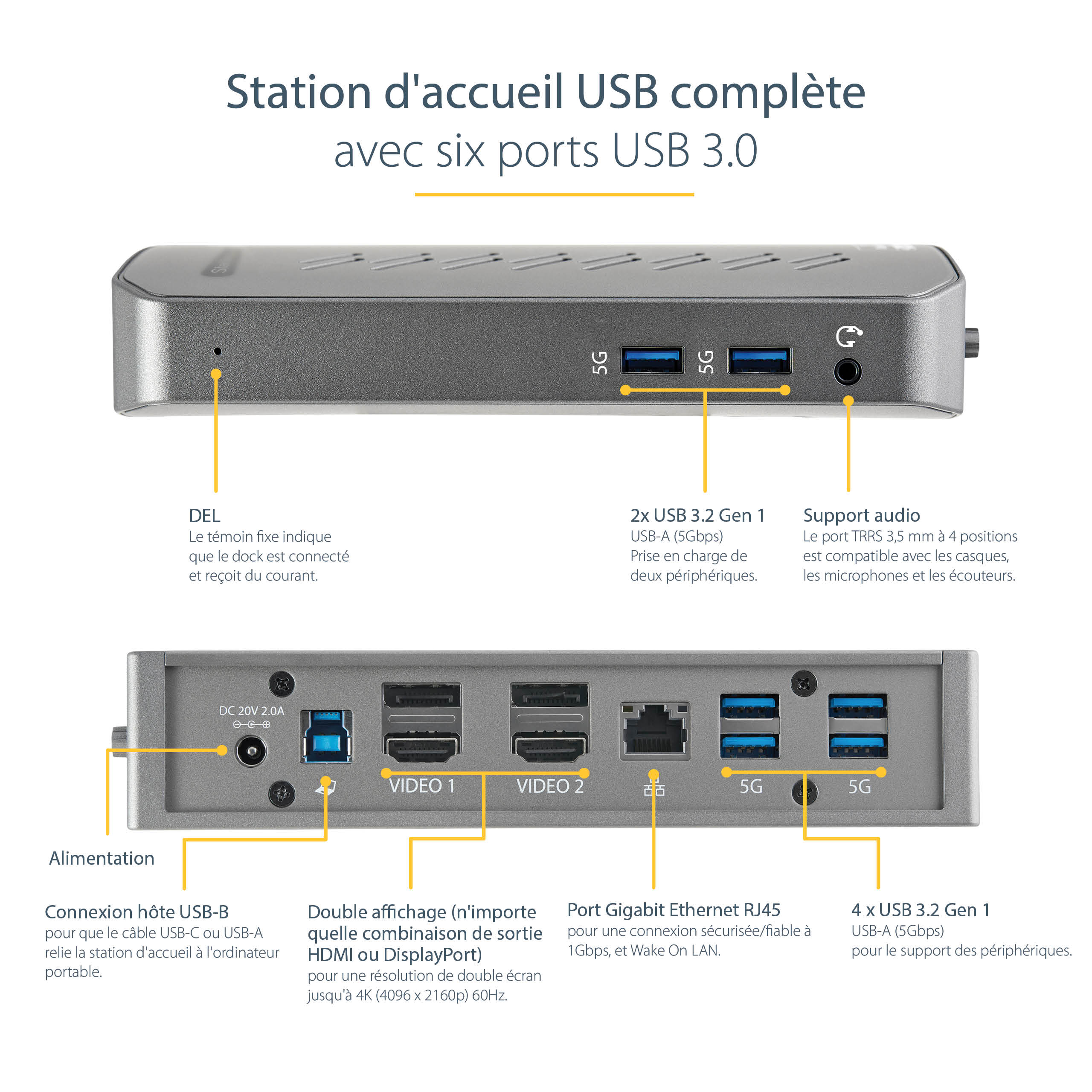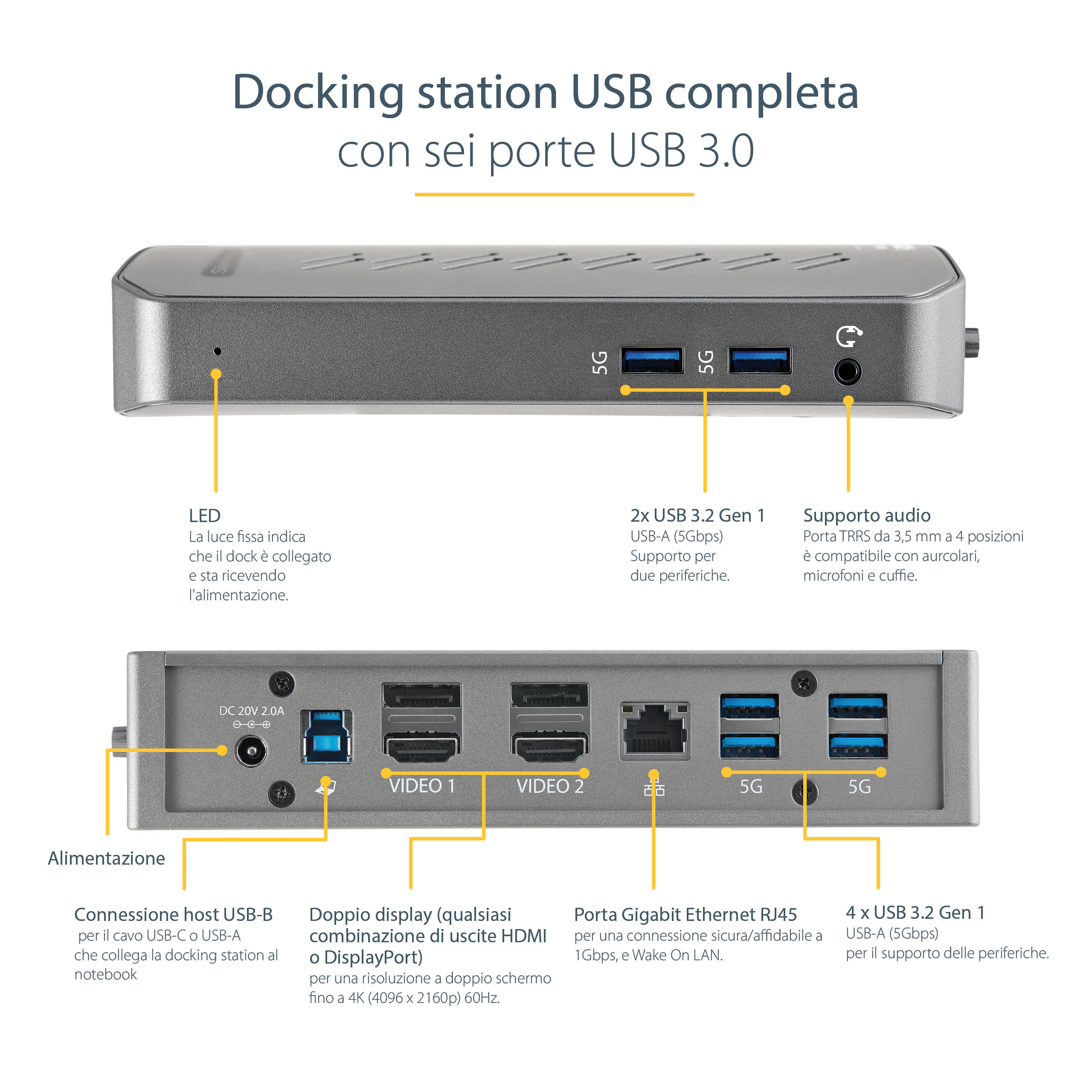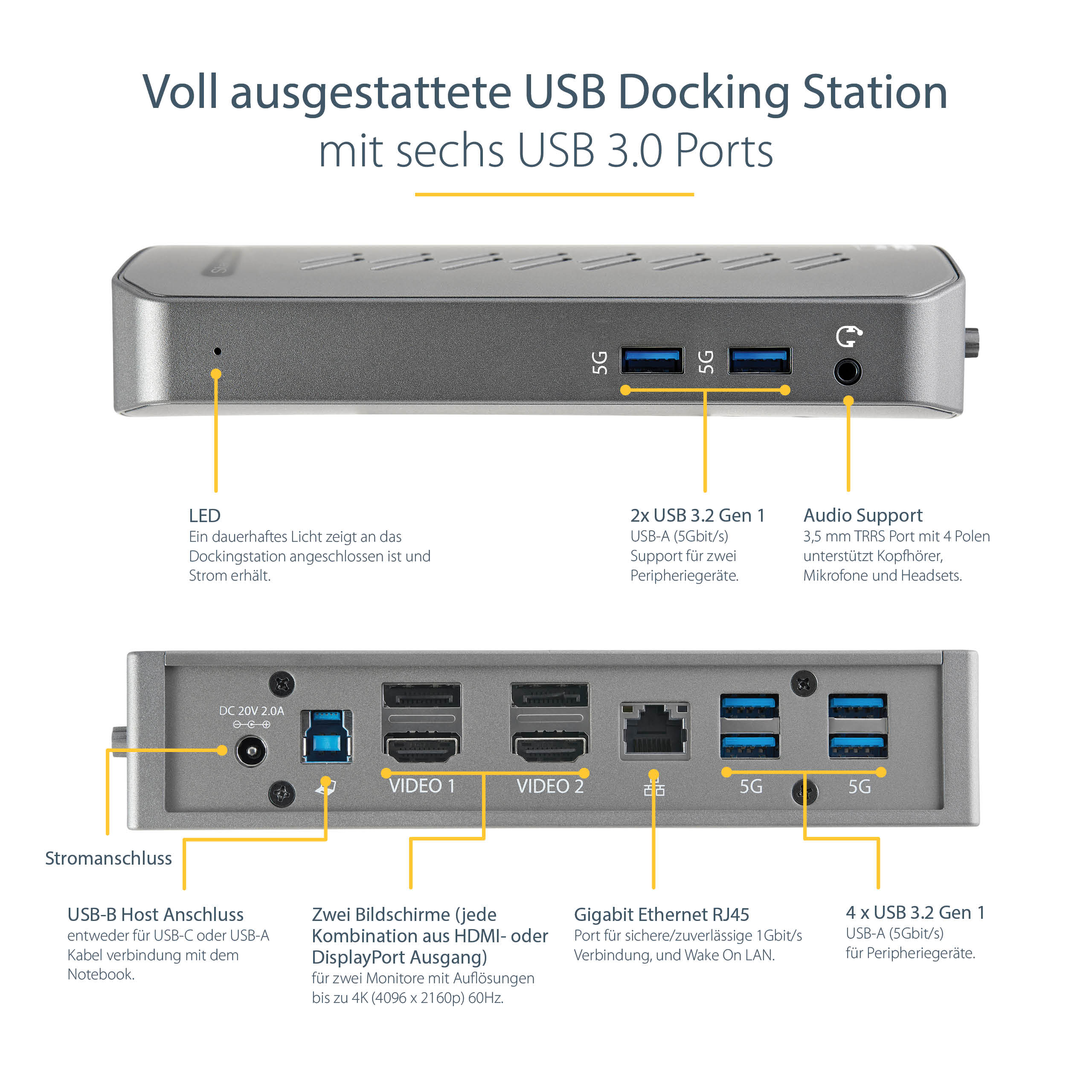 The StarTech.com DK30A2DHU laptop dock/port replicator features a sleek, matte black finish that complements professional office environments. Its compact footprint ensures it fits comfortably on desks without occupying excessive space. The sturdy build quality reflects durability, making it suitable for daily use in busy workspaces. Thoughtful port placement enhances cable management and accessibility.