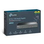 The TP-Link TL-SX1008 network switch features a sleek, compact metal chassis that fits neatly into any rack or desktop setup. Its minimalist design with LED indicators provides clear status visibility without clutter. The fanless construction ensures quiet operation, making it ideal for open office spaces or small server rooms. Overall, it combines practicality with a professional aesthetic suited to modern business environments.